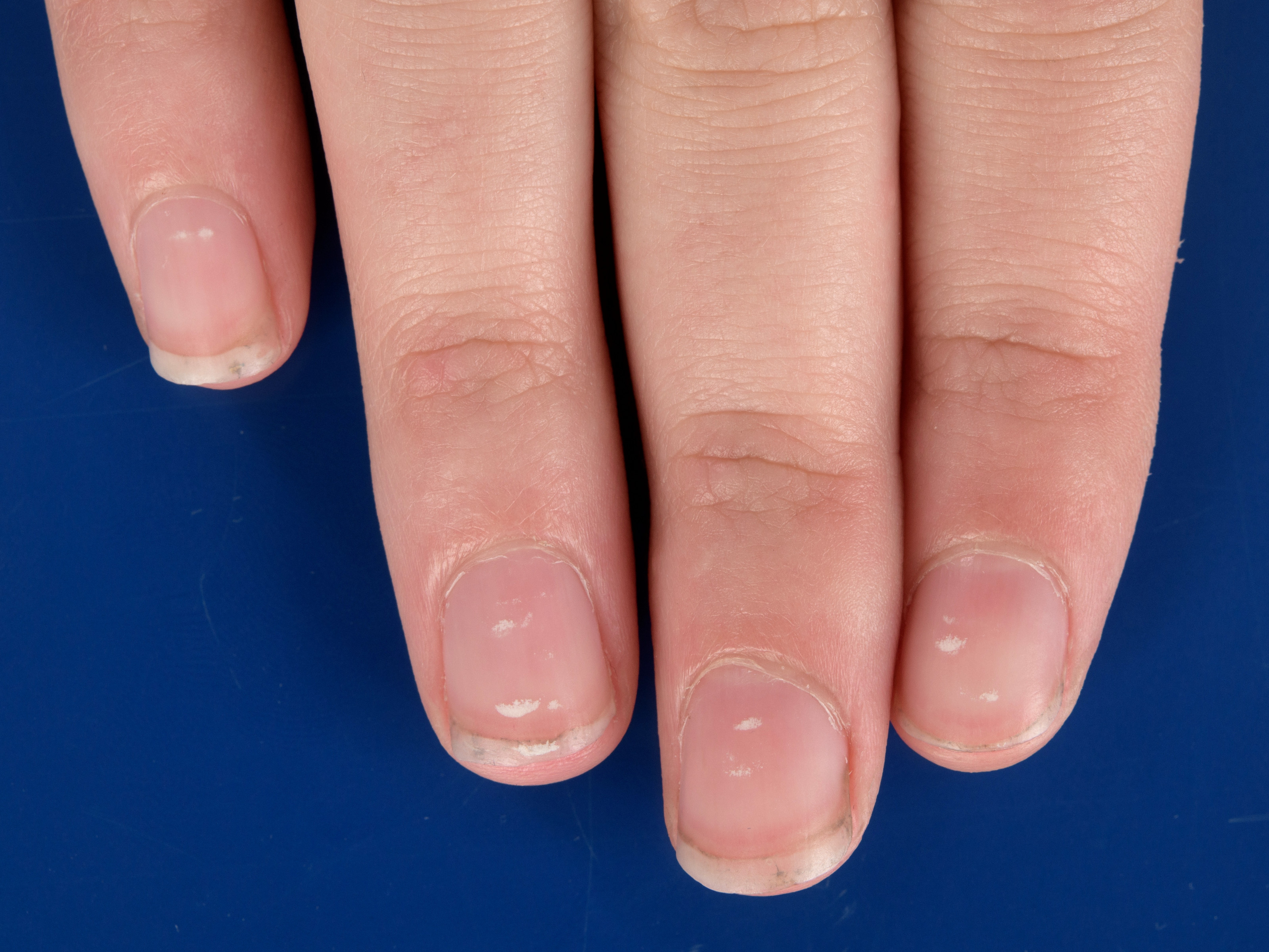 ![]() Leukonychia punctata Leukonychia punctata komt vaak voor, vooral bij kinderen (vaak door trauma, geen onderliggende ziekte). Het kan ook voorkomen bij inflammatoire huidziekten zoals alopecia areata. Zie verder onder leukonychia. |