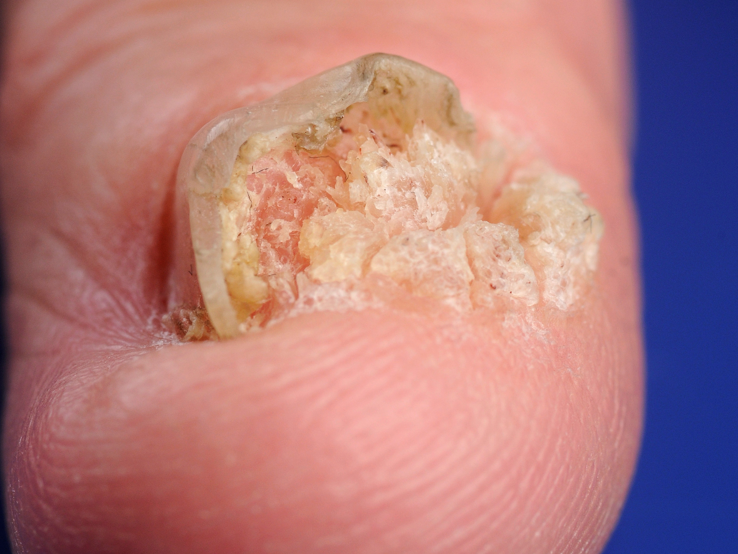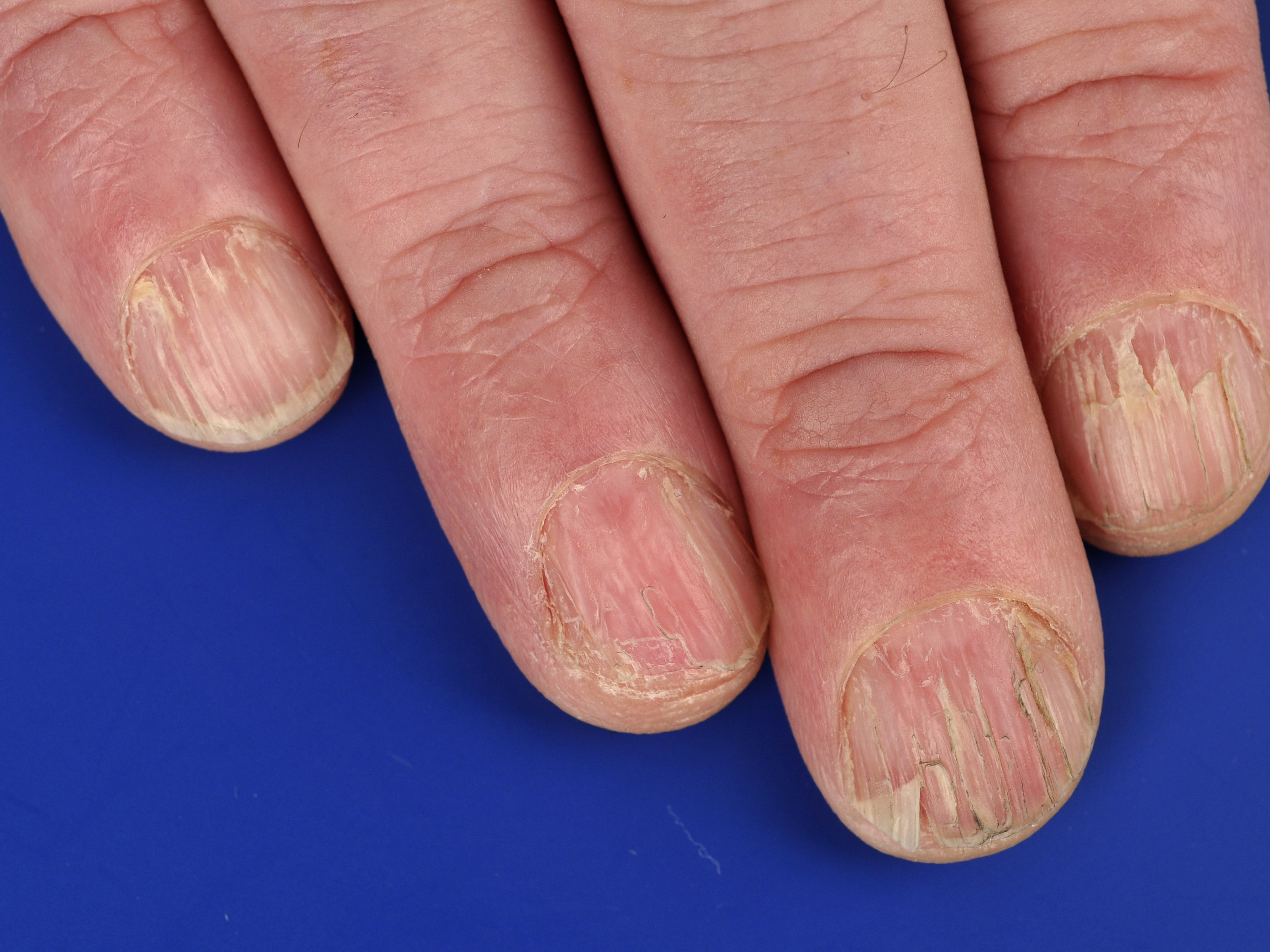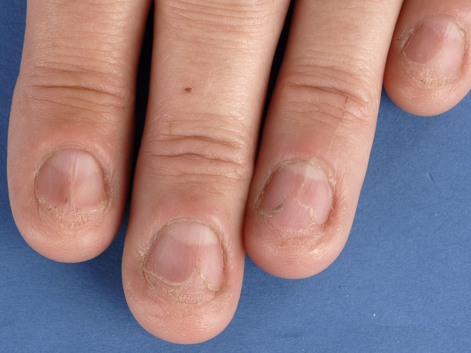 ![]() Slijtage van de nagels, mechanische beschadiging (worn down nails) Van chronische blootstelling aan trauma, bijvoorbeeld door nagelbijten of beroepsmatig, worden nagels ook dun en kwetsbaar. |
