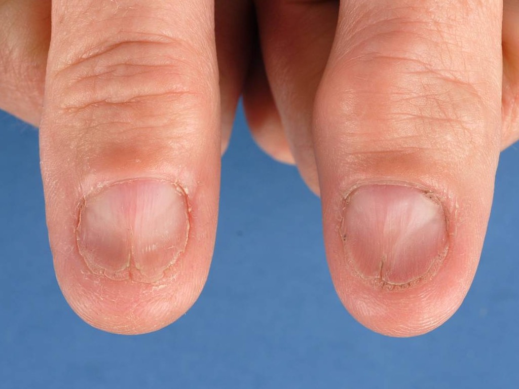 ![]() Dunne nagelplaat door amyloidosis Zeldzaam, kan de enige manifestatie zijn van systemische amyloidose. |