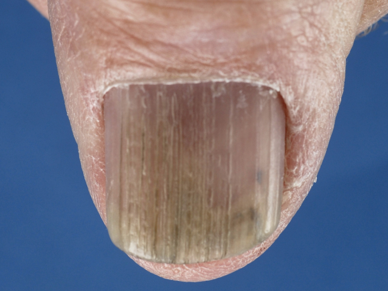 ![]() Dunne nagelplaat door nagel fragiliteit, onychorrhexis, beading Nagelfragiliteit (kwetsbare nagels) komt vooral voor op oudere leeftijd. De entiteit onychorrhexis is niet zo duidelijk omschreven als andere nagelafwijkingen (bv pterygium), maar de kern van het begrip is dus dat de nagels dun zijn en breekbaar, met groeven en scheurtjes aan het distale einde. Longitudinale groeven zijn op oudere leeftijd een normaal verschijnsel en kunnen gepaard gaan met hobbeltjes in de nagel (beading). Zie ook onder onychorrhexis. Foto: Dimitrios Malamos - Wikimedia (Creative Commons License 3.0). |
