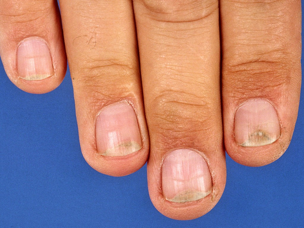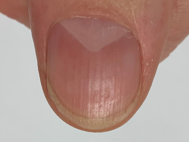 ![]() Geen lunula Het ontbreken van de lunula komt voor bij chronische nierinsufficiëntie, hemodialysepatiënten, niertransplantatie patiënten, leverafwijkingen, alopecia areata, hypothyreoidie, SLE. |