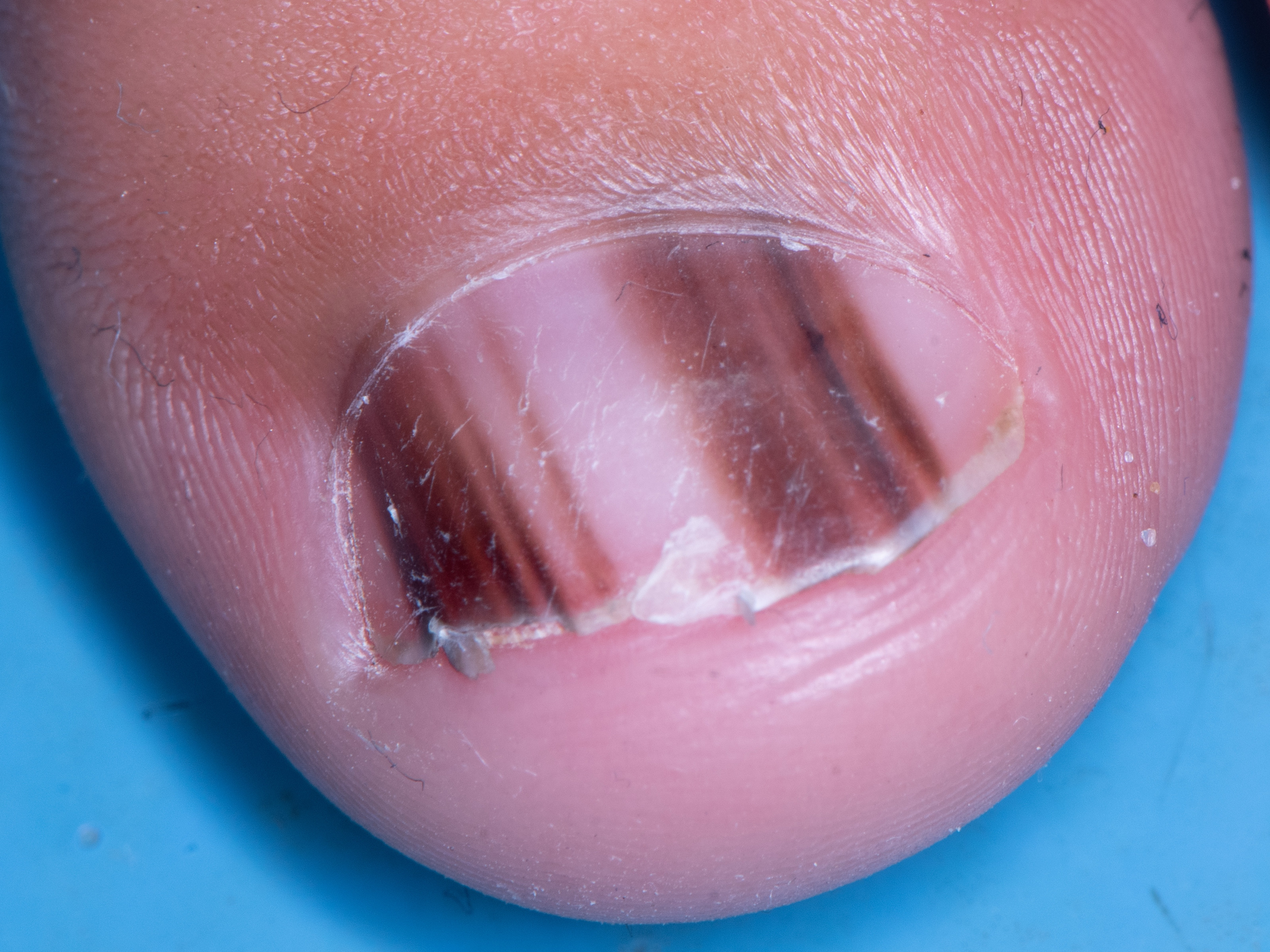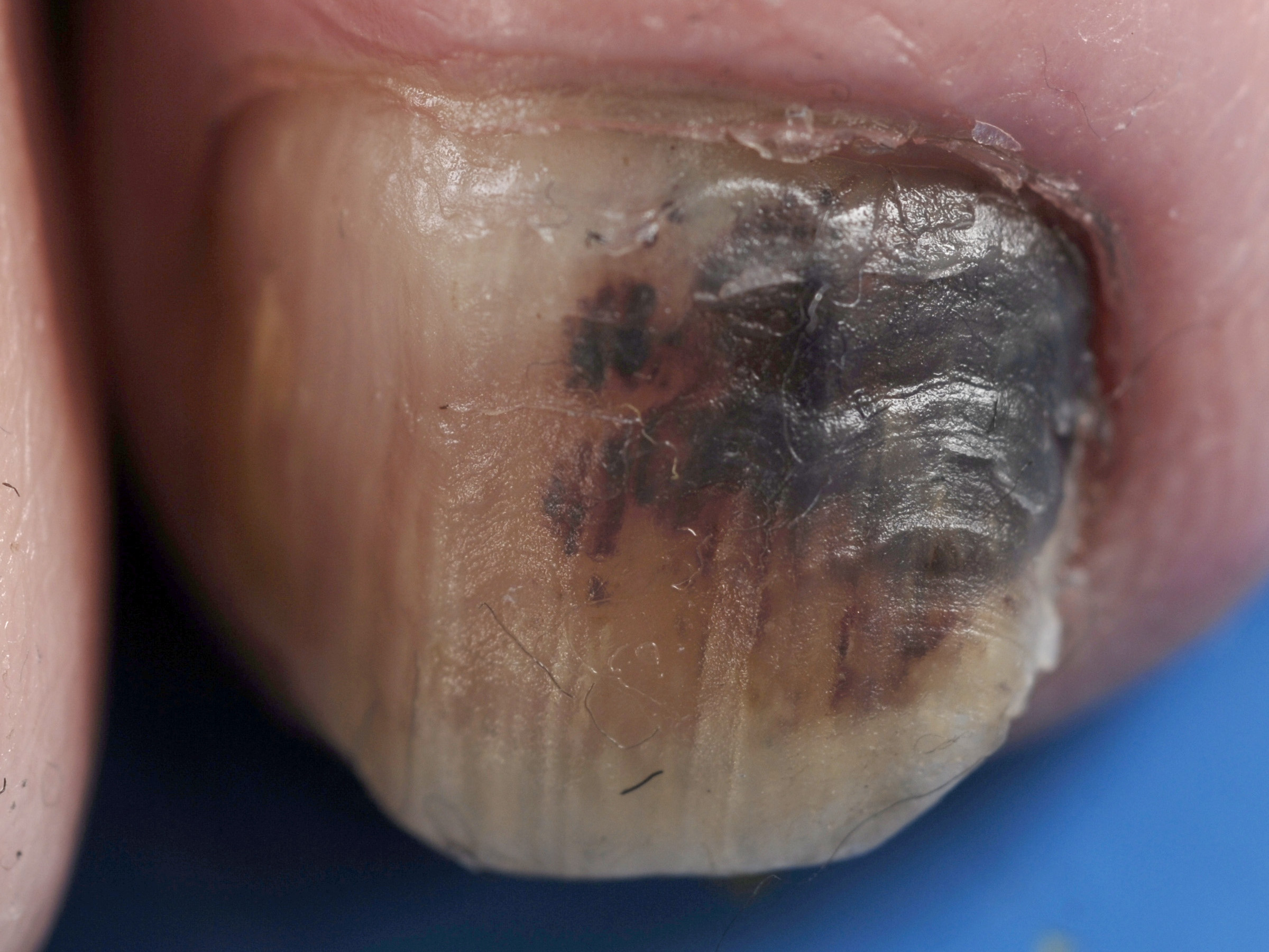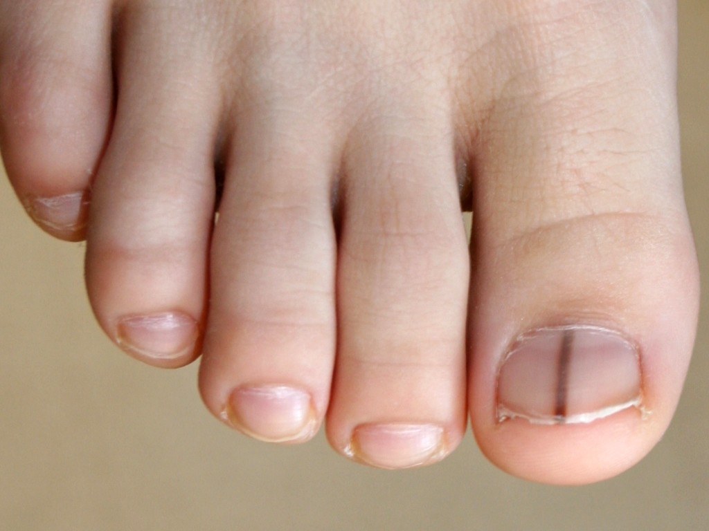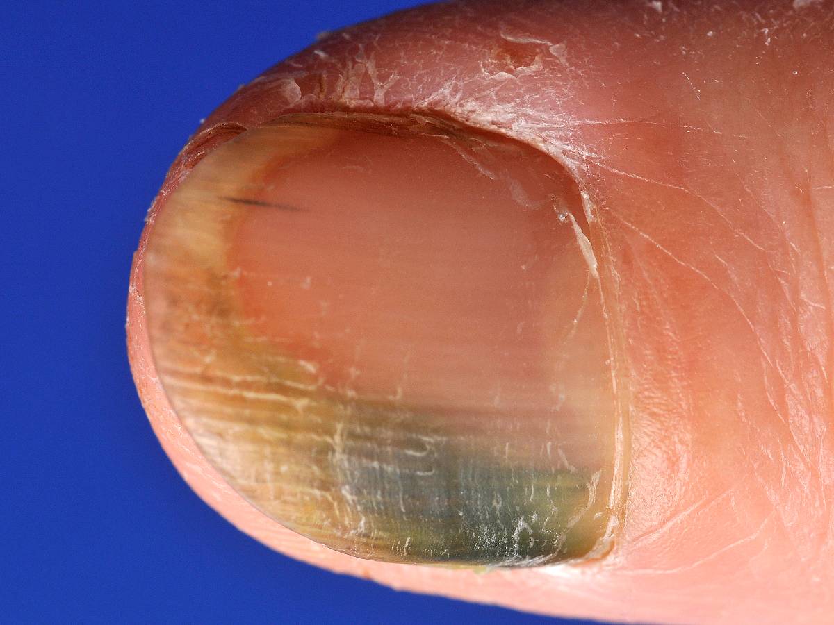 ![]() Subunguaal melanoom Ook een subunguaal melanoom kan longitudinale bruine of zwarte verkleuringen veroorzaken. Soms moeilijk te onderscheiden van een subunguaal hematoom, of benigne varianten van melanonychia veroorzaakt door een naevus, of rasgebonden hyperpigmentatie. Zie onder subunguaal melanoom, maligne melanoom en ook onder subunguaal hematoom (voor de verschillen tussen beide nagelafwijkingen). |