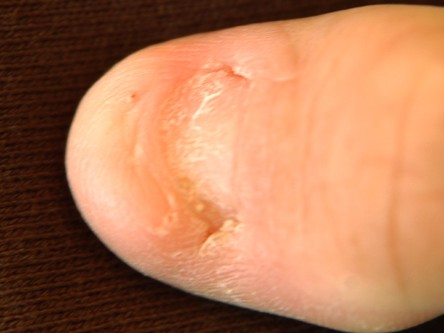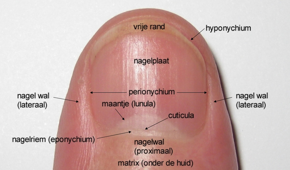 ![]() Hang nails Hang nails: pijnlijk scheurtje, meestal distaal in de laterale nagelriem (blijft haken achter van alles). Therapie: afknippen loshangend deel, vethouden, zonodig afdekken met pleister. Foto: Standardizer - Wikimedia - Creative Commons License 1.0 - Public Domain Image). |