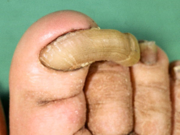 ![]() Onychogryposis (lange kromme nagels) Bij onychogryposis zijn de nagels te lang en totaal krom uitgegroeid, soms in krullen. De nagels zijn ook te dik (hyperkeratotisch) en niet meer te knippen daardoor. Zie verder onder onychogryposis. |