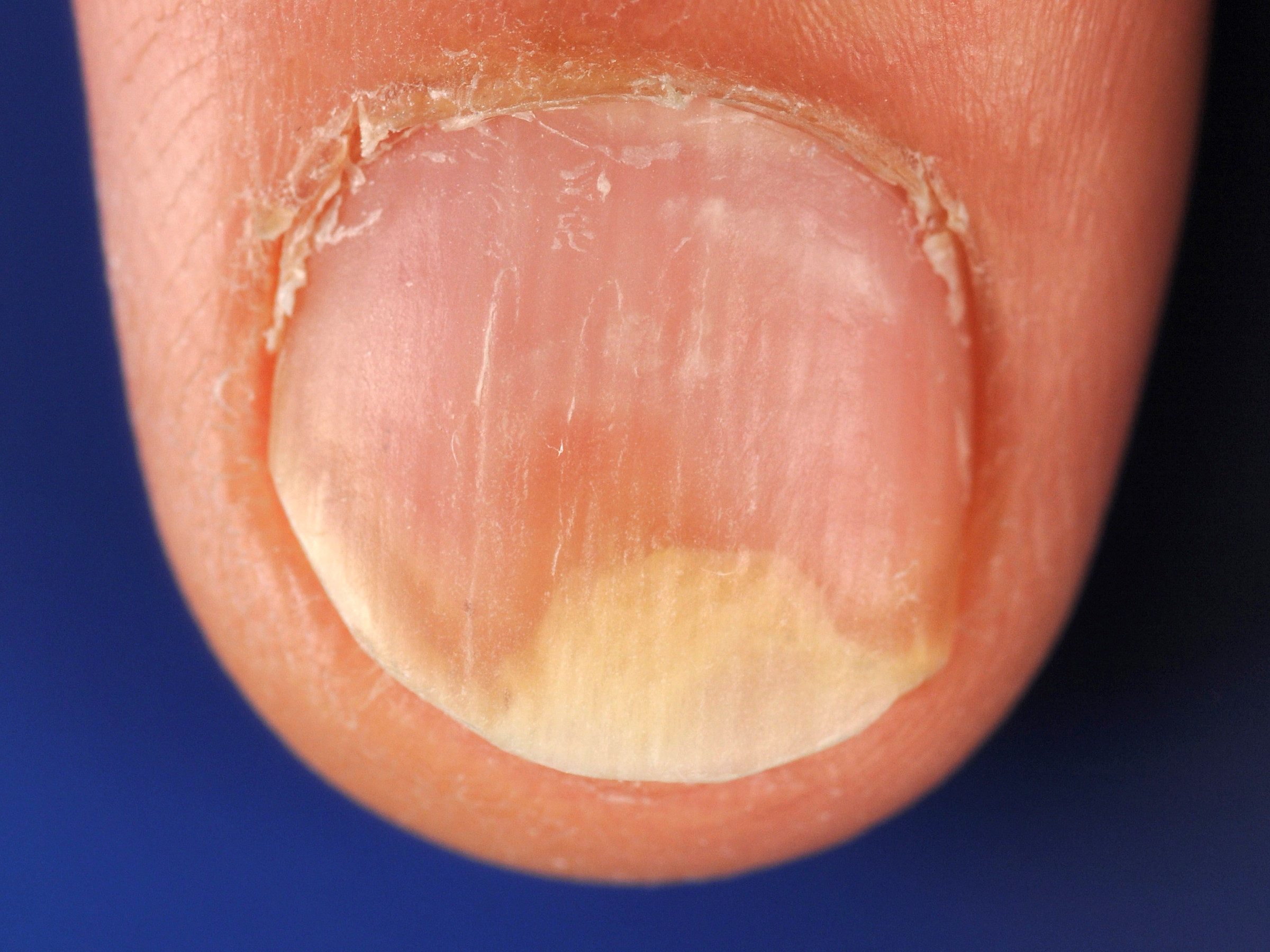 ![]() Gele verkleuringen Bij onychomycose kunnen verschillende nagelveranderingen ontstaan: gele verkleuring, brokkelige nagels, onycholysis, olievlekfenomeen, subunguale hyperkeratose en algehele hyperkeratose. Een gele verkleuring (yellow streaks) van een nagel aan 1 kant van de nagel is suggestief voor een mycose (kan zowel door dermatofyten als door gisten zoals Candida albicans worden veroorzaakt). Zie verder onder onychomycose. |