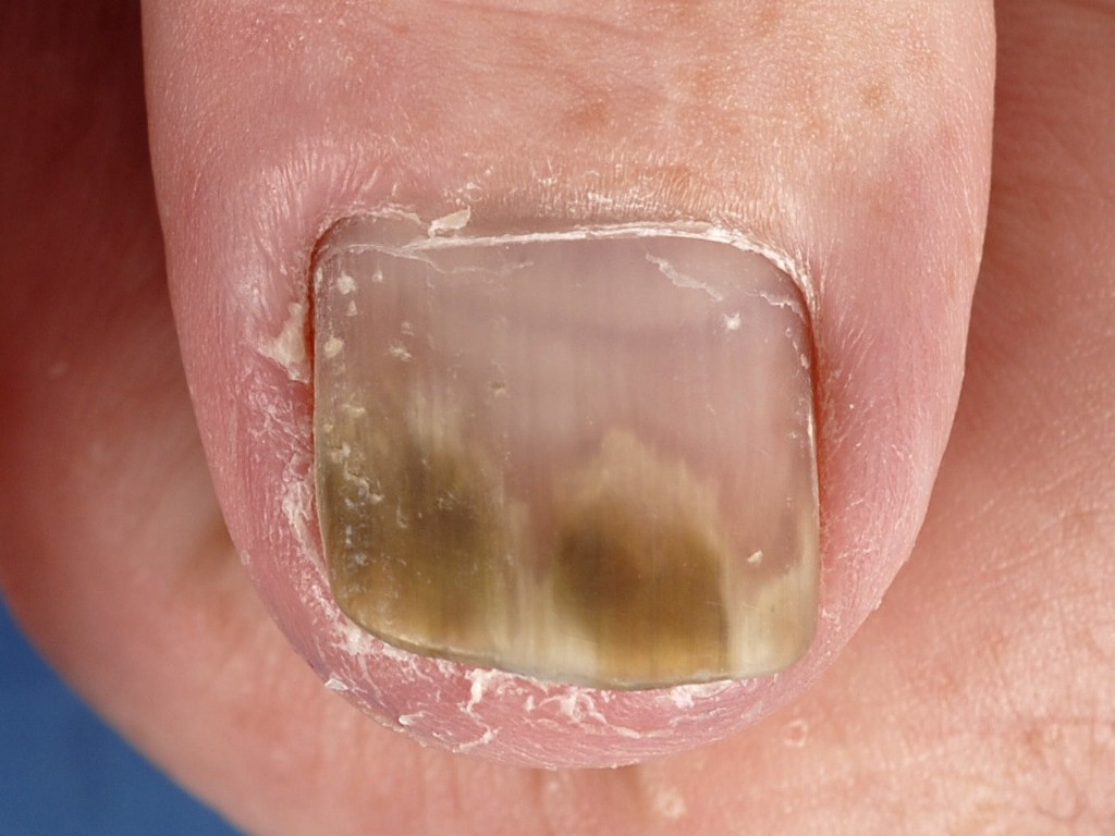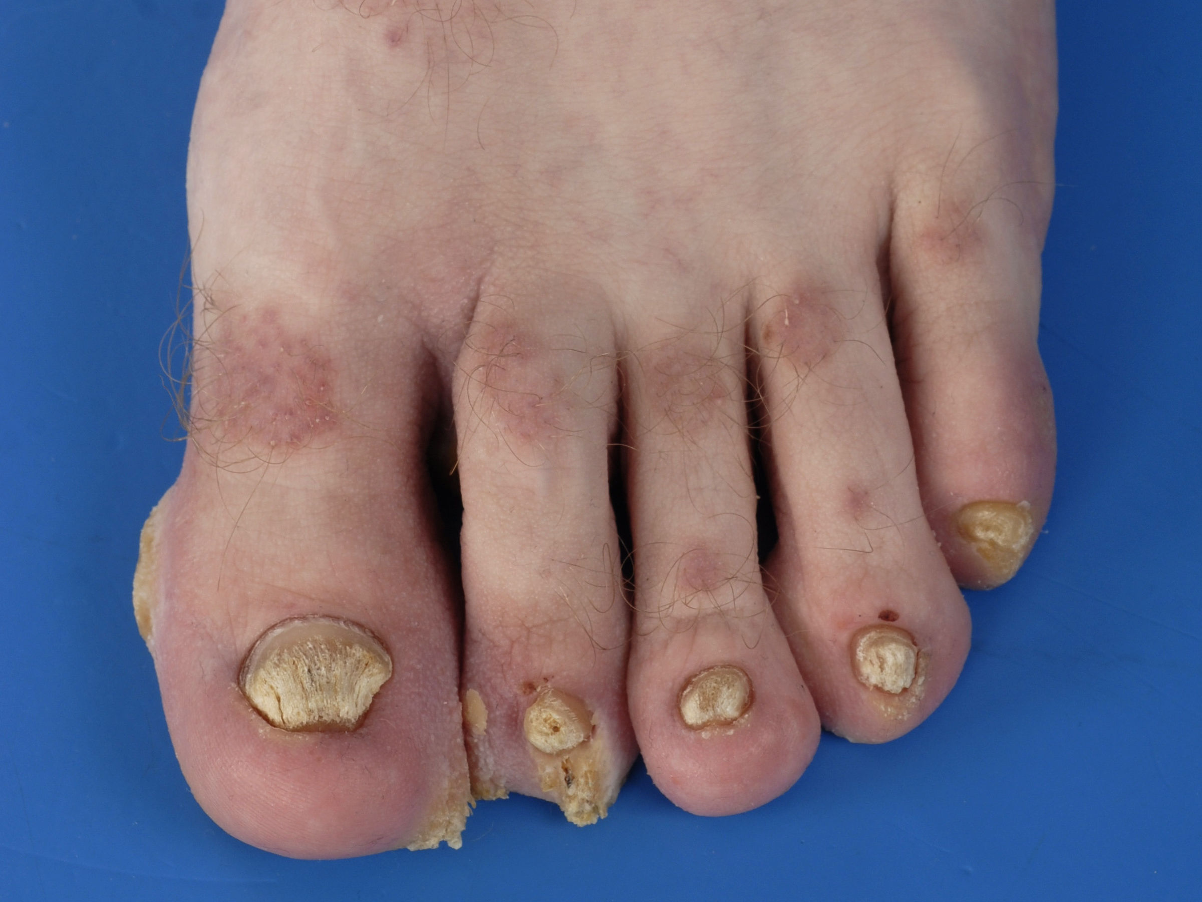 ![]() Onychomycose (trichophyton) Een onychomycose is een infectie van de nagel door schimmels of gisten. De meeste nagelinfecties worden veroorzaakt door Trichophyton, vooral T. rubrum. Zie verder onder onychomycosen. |