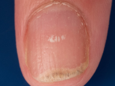 ![]() Distale onycholysis Distale onycholysis betekent loslating van de nagel aan het distale einde en komt o.a. voor bij psoriasis, vaak in combinatie met subunguale hyperkeratose. Ook komt het voor bij pityriasis rubra pilaris en als bijwerking van geneesmiddelen. Gedeeltelijke distale loslating (onycholysis semilunaris) kan ook ontstaan door chronische inwerking van water. Zie verder onder distale onycholysis, psoriasis unguium en onder onycholysis semilunaris. |
