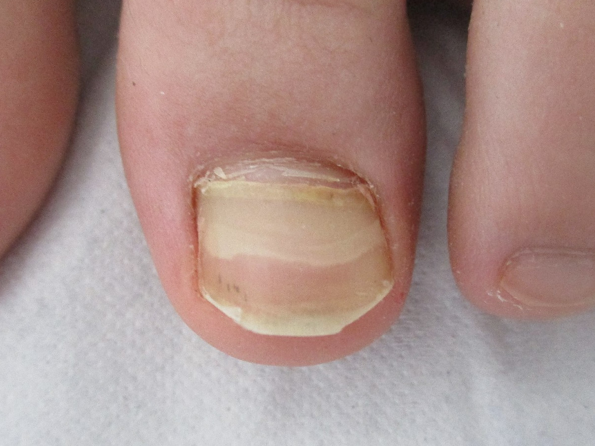 ![]() Mees' lines Mees' lines zijn ook transversale groeven maar met minder of geen schade, tonen de zelfde kleur en curve als de lunula. Oorzaken van Mees's lines zijn arsenicum vergiftiging, selenium vergiftiging (selenosis), koolmonoxide vergiftiging, chemotherapie, ziekte van Hodgkin’s disease, hartfalen, lepra, malaria, andere koortsende ziekten. Zie verder onder Mees' lines. Foto: Yannick Trottier - Wikimedia (Creative Commons License 3.0). |