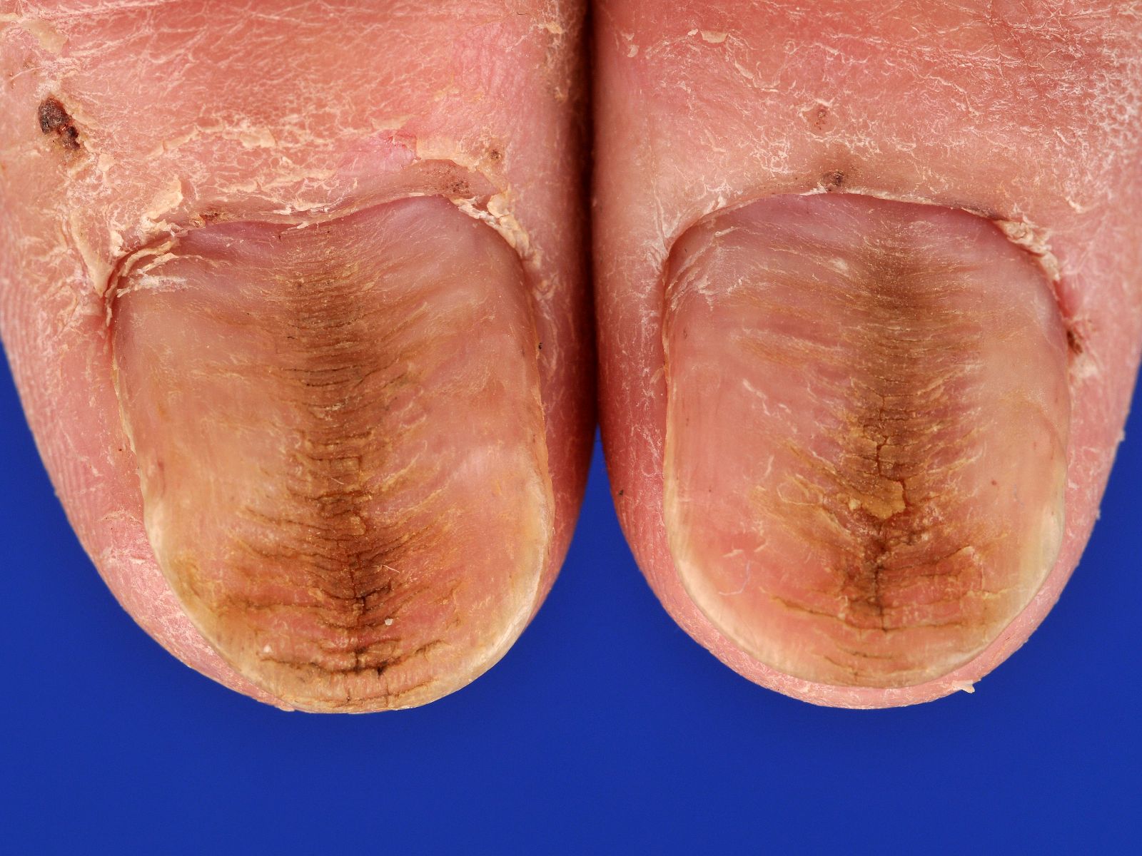 ![]() Longitudinale groeven Longitudinale groeven (ridged nail, neapolitan nail) komen vaak voor, zonder betekenis, vooral op oudere leeftijd, en kunnen grijswit tot geel gekleurd zijn. Komen ook voor in het kader van dermatosen (lichen planus, psoriasis, amyloidosis, Raynaud, TEN, alopecia areata, CDLE, porokeratosis Mibelli, epidermolysis bullosa). |