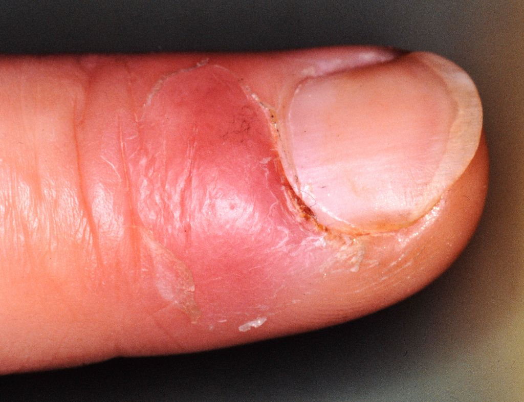![]() Panaritium door herpes (herpetic whitlow) Een Herpes simplex panaritium (Engelse term: herpetic whitlow) is een herpes infectie van een vinger, meestal dig I. Het kan recidiverend voorkomen. Herpes blaasjes aan de vingers komen als beroepsziekte voor bij tandartsen. Het kan secundair infecteren met S. aureus en overgaan in een gewone bacteriële panaritium. Zie verder onder herpes simplex panaritium. |