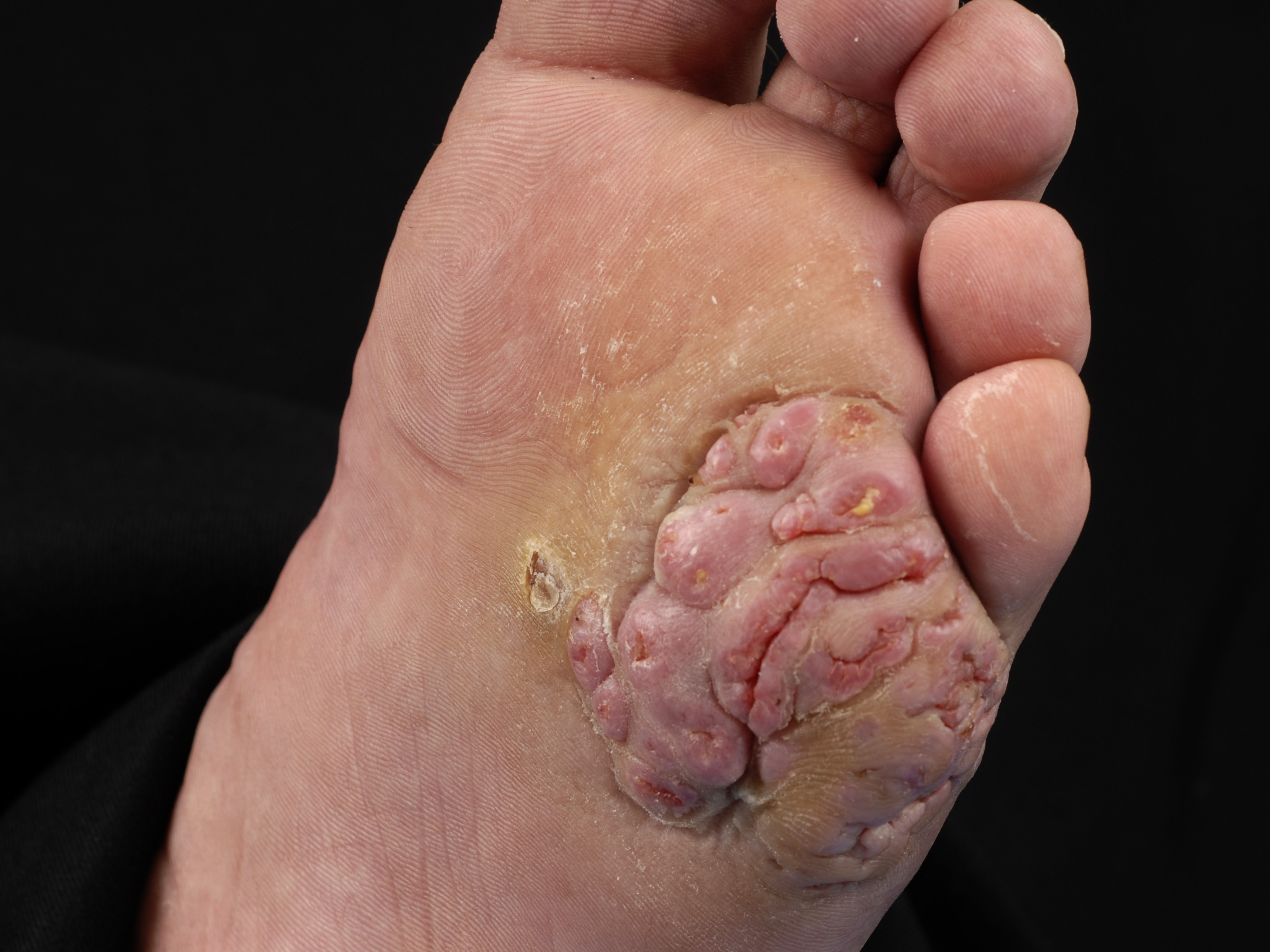 ![]() Verruceus carcinoom Een verruceus carcinoom komt vaak voor op de voet, maar zit meestal niet onder de nagel. Zie verder onder verruceus carcinoom. |