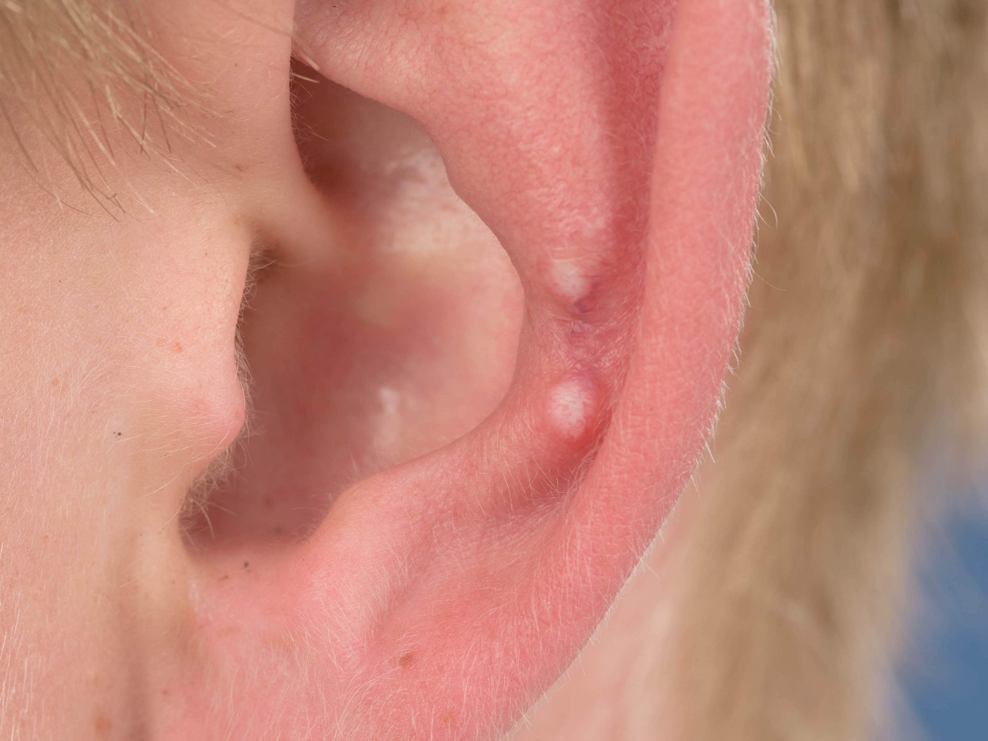 ook op andere plaatsen zoals op de oogleden, de oren, de rugwervels en ribben, voetzolen,