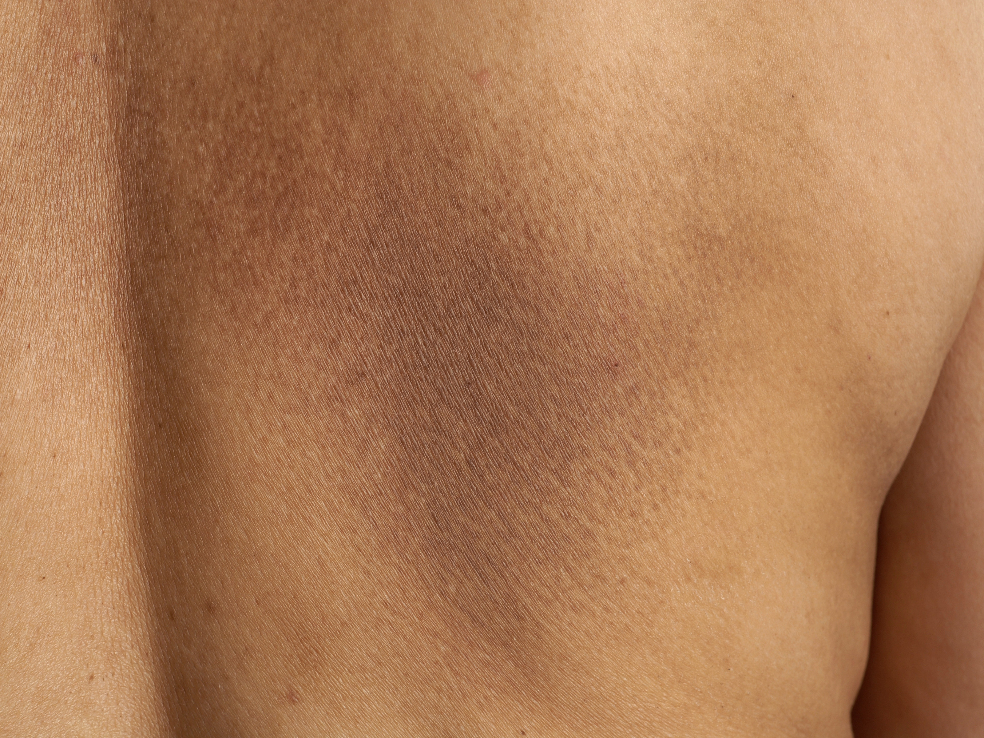 niet geïndureerde macula infrascapulair of op een van de scapulae, meestal 3-10