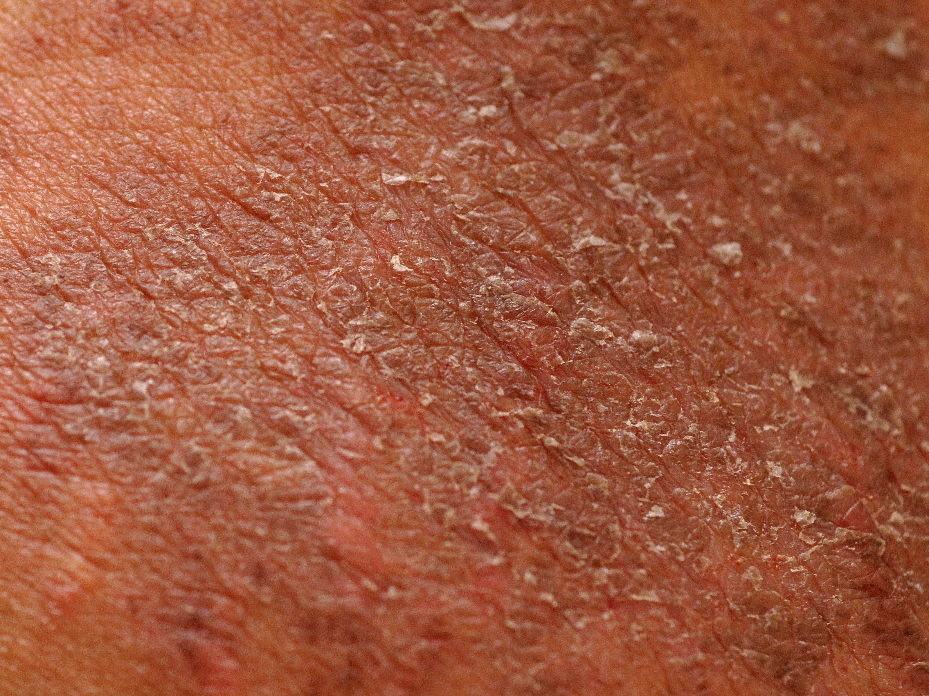droog, met scheurtjes en bruine schilfers en zwartbruine crustae. De pijn wordt