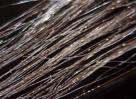 Licht gekleurde noduli op de haren, zacht aanvoelend en makkelijk los te krijgen,