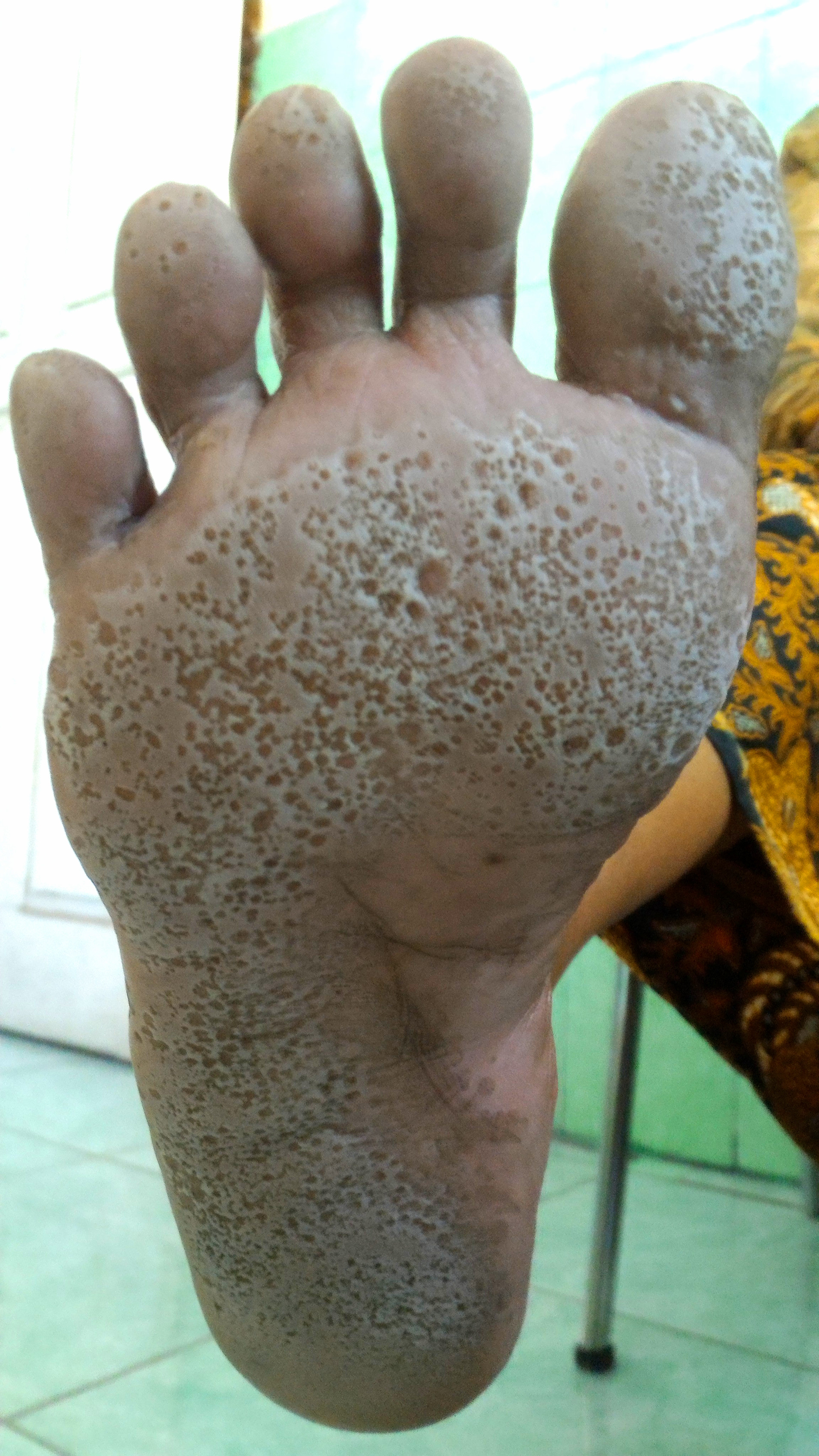 op de voetzolen en een onwelriekende geur zijn pathognomonisch.