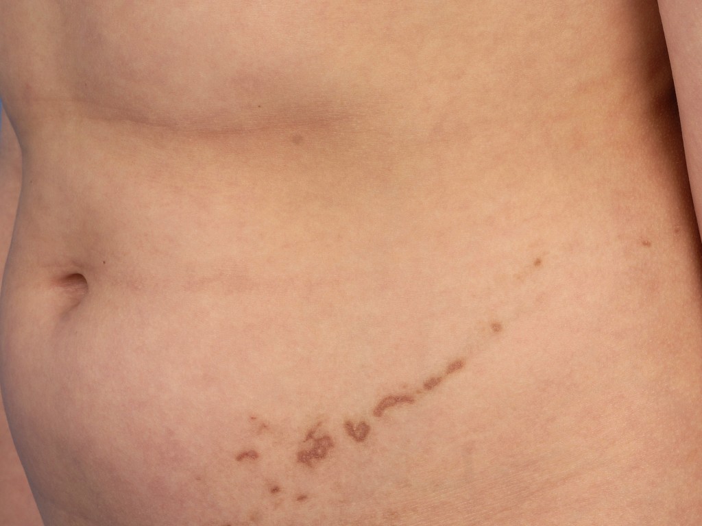 volgens de Blaschko lijnen. Daarnaast speelt actinische beschadiging een rol