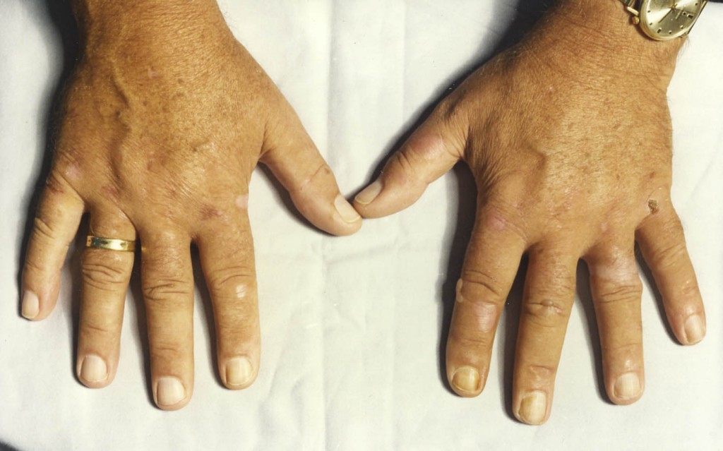wasachtige littekens; meestal geen blaarvorming, in ca 5 % van de