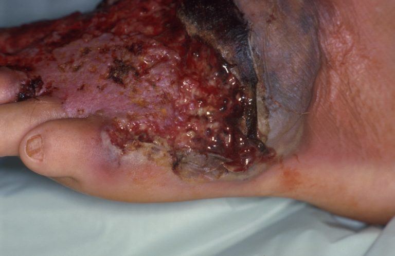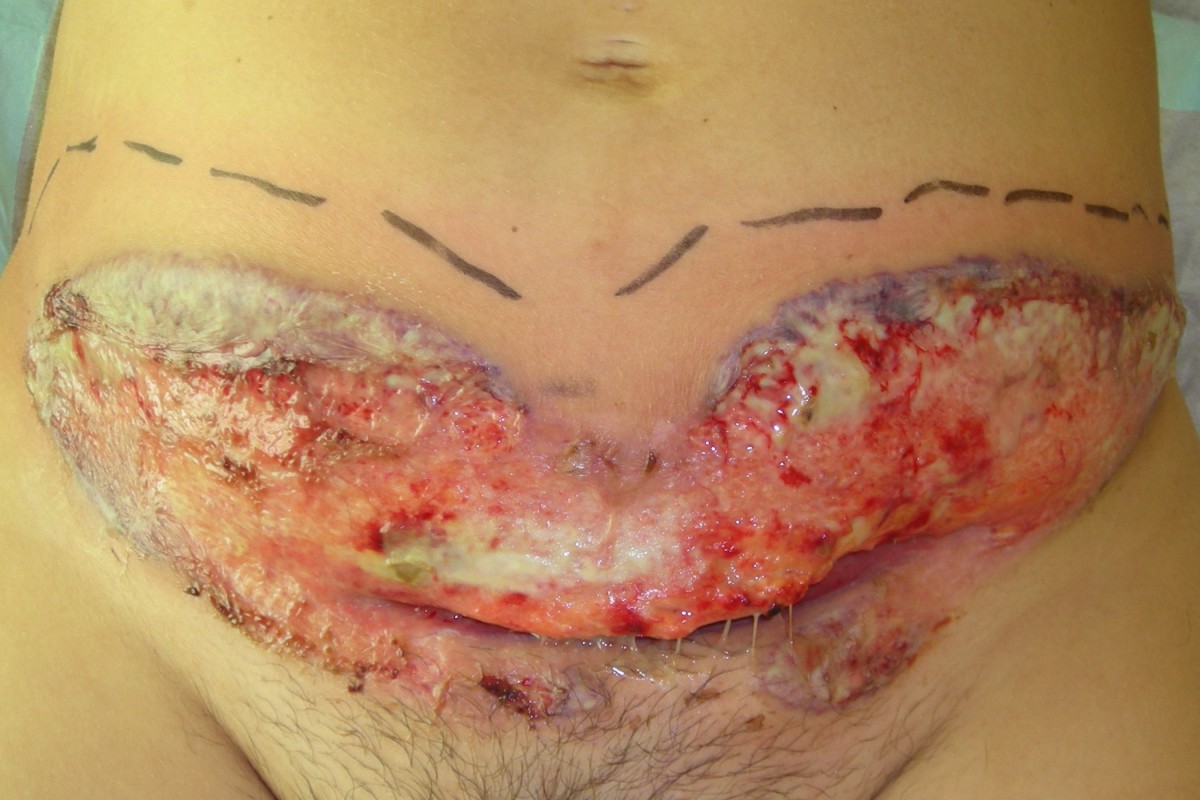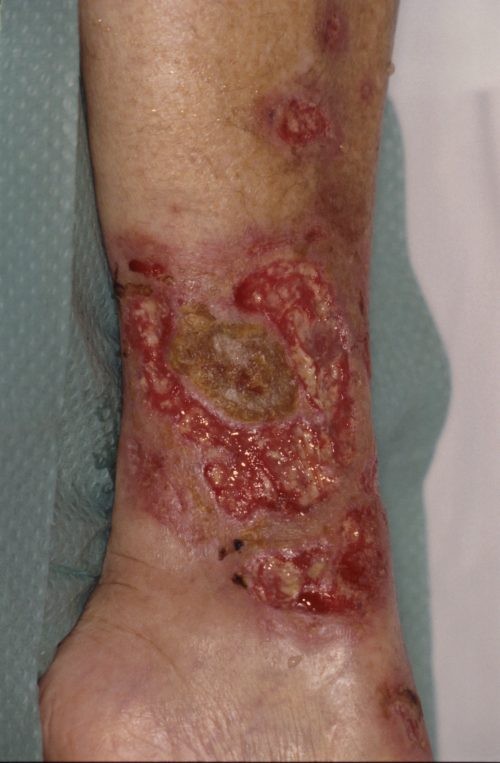 bullae, of papels. Spoedig ontstaat een irregulair, diep (tot in het vet of