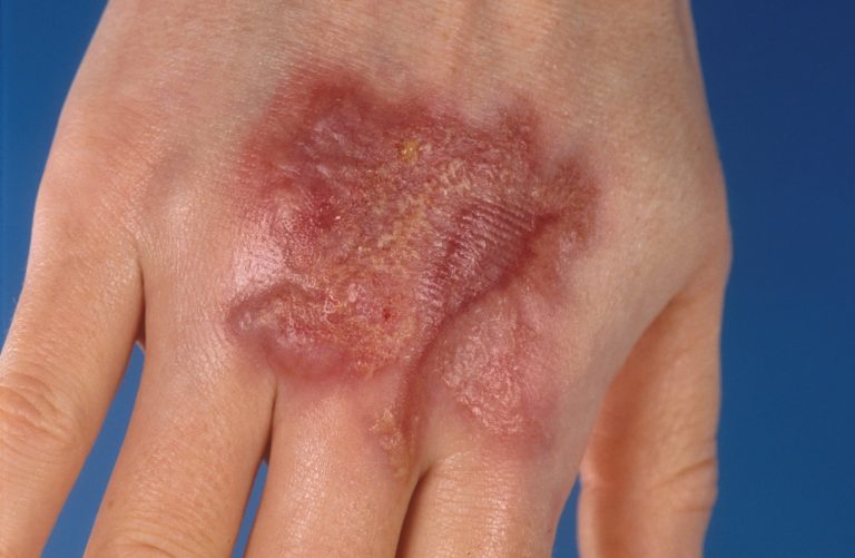 tot handpalmgroot infiltraat met licht rood-livide rand, soms ontstaan pustels,