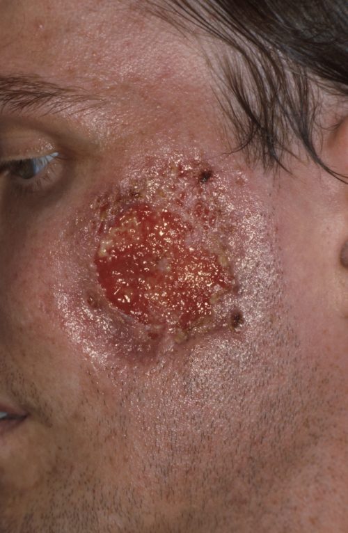 - langzaam groter wordend ulcus - opgeworpen, paarse rand,