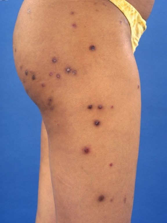 elk deel v.d. huid aandoen, met een voorkeur voor onderbenen, abdomen, billen,