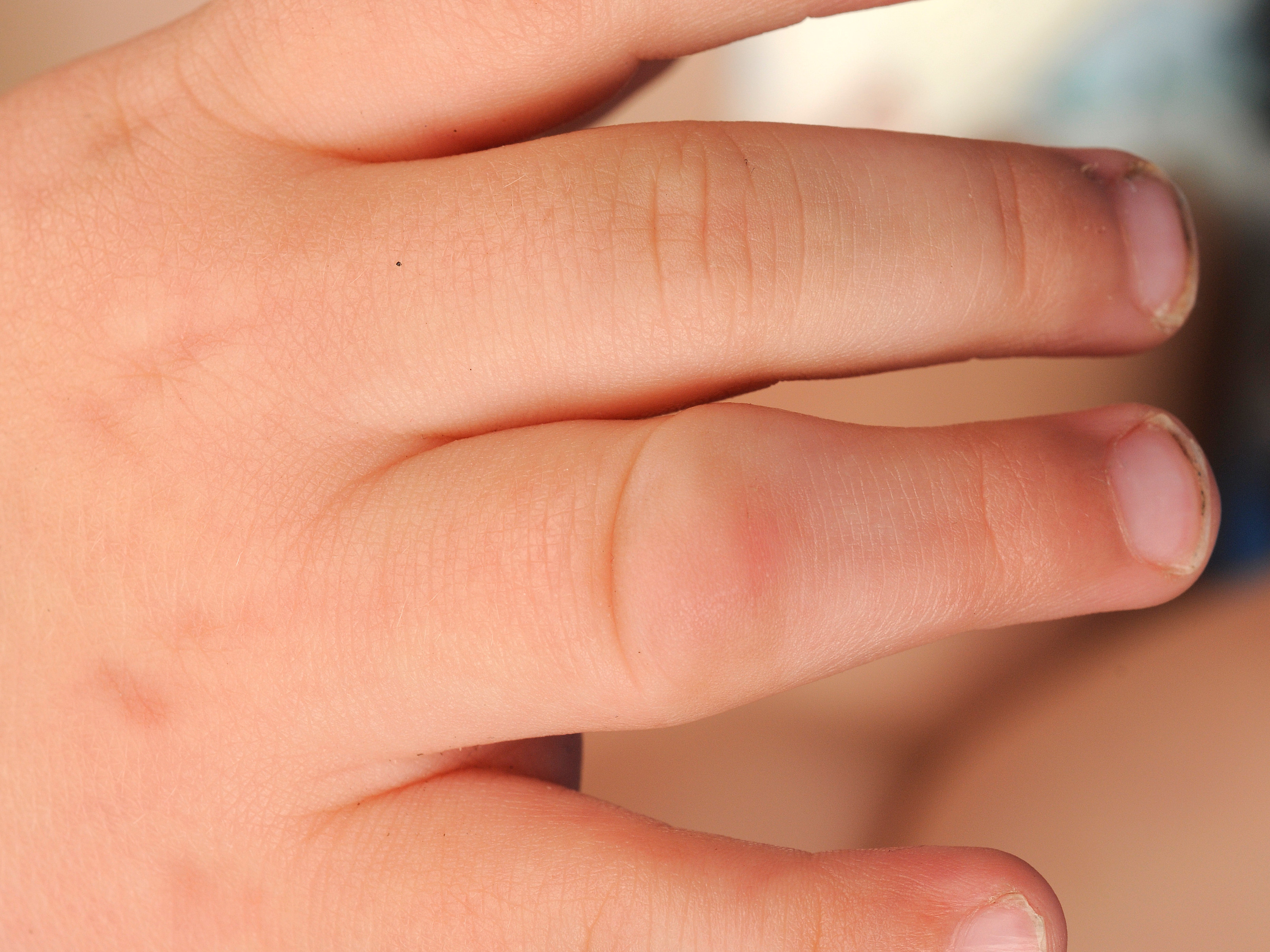 joints). De verdikking zit met name lateraal en dorsaal, waardoor de vingers