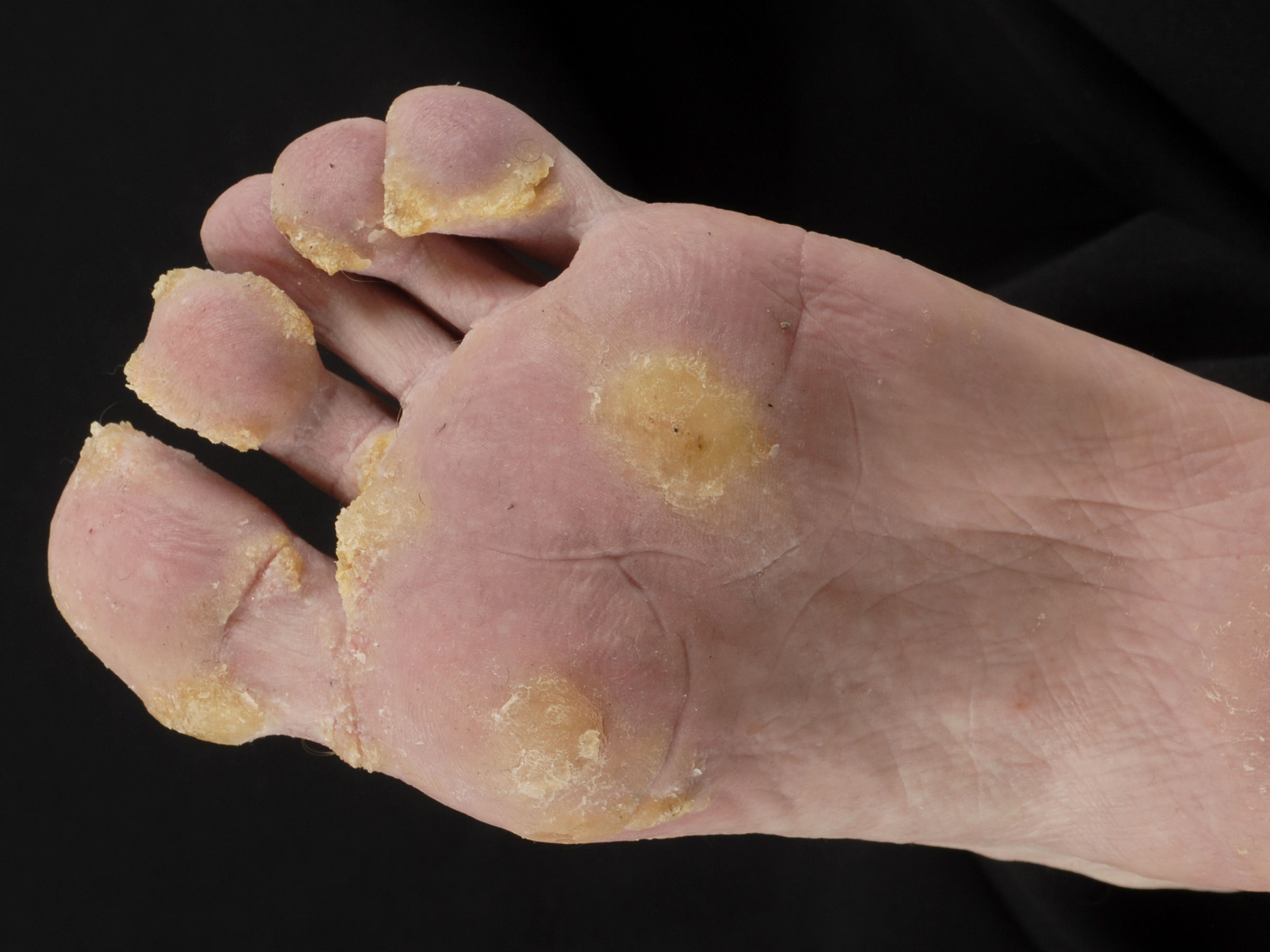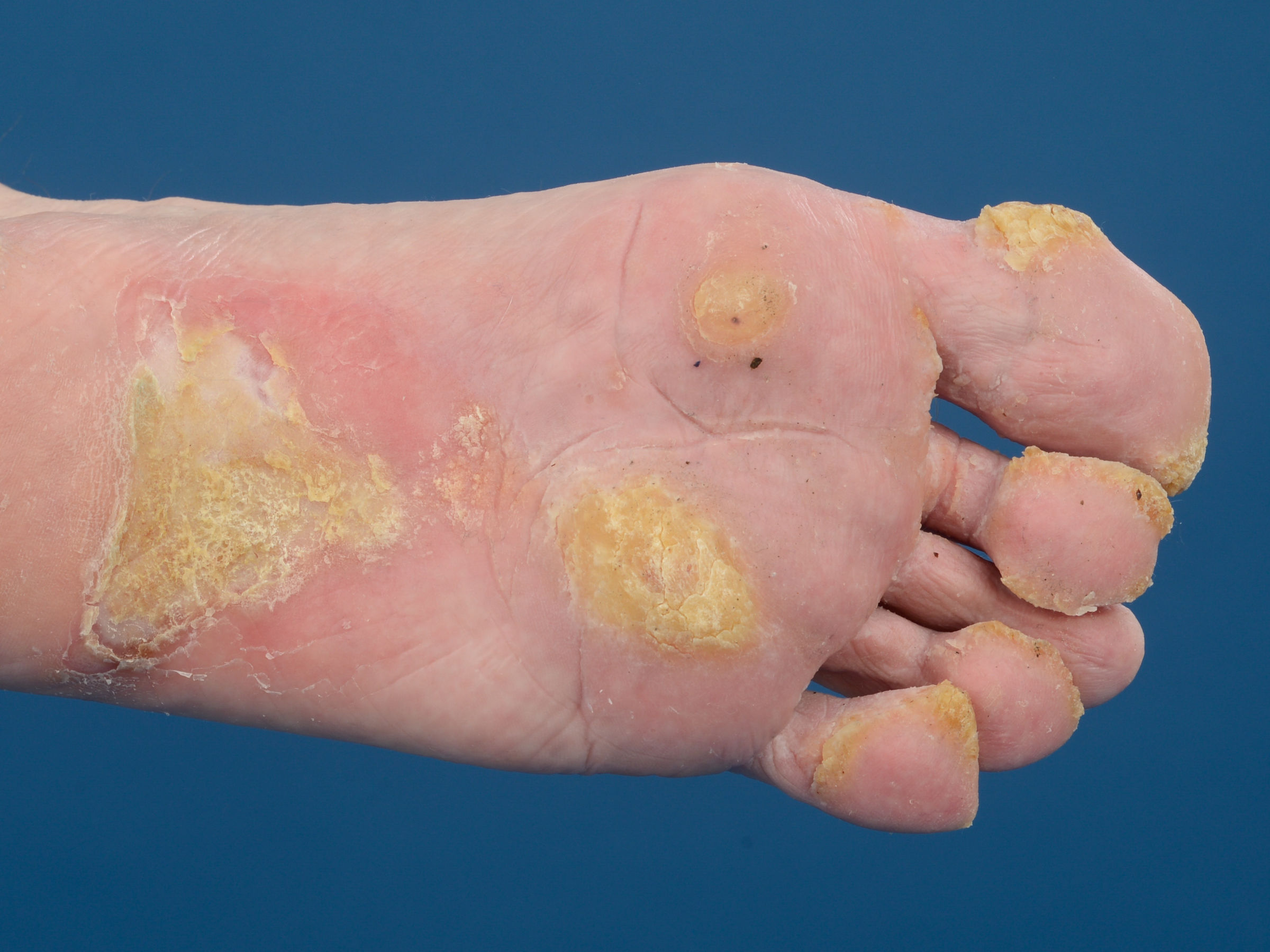 vooral op de drukplaatsen, en is pijnlijk. De pijnlijke voetzolen zijn de meest