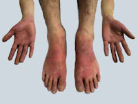 purpura. Het is gelokaliseerd aan de handen en voeten, in een handschoenen /