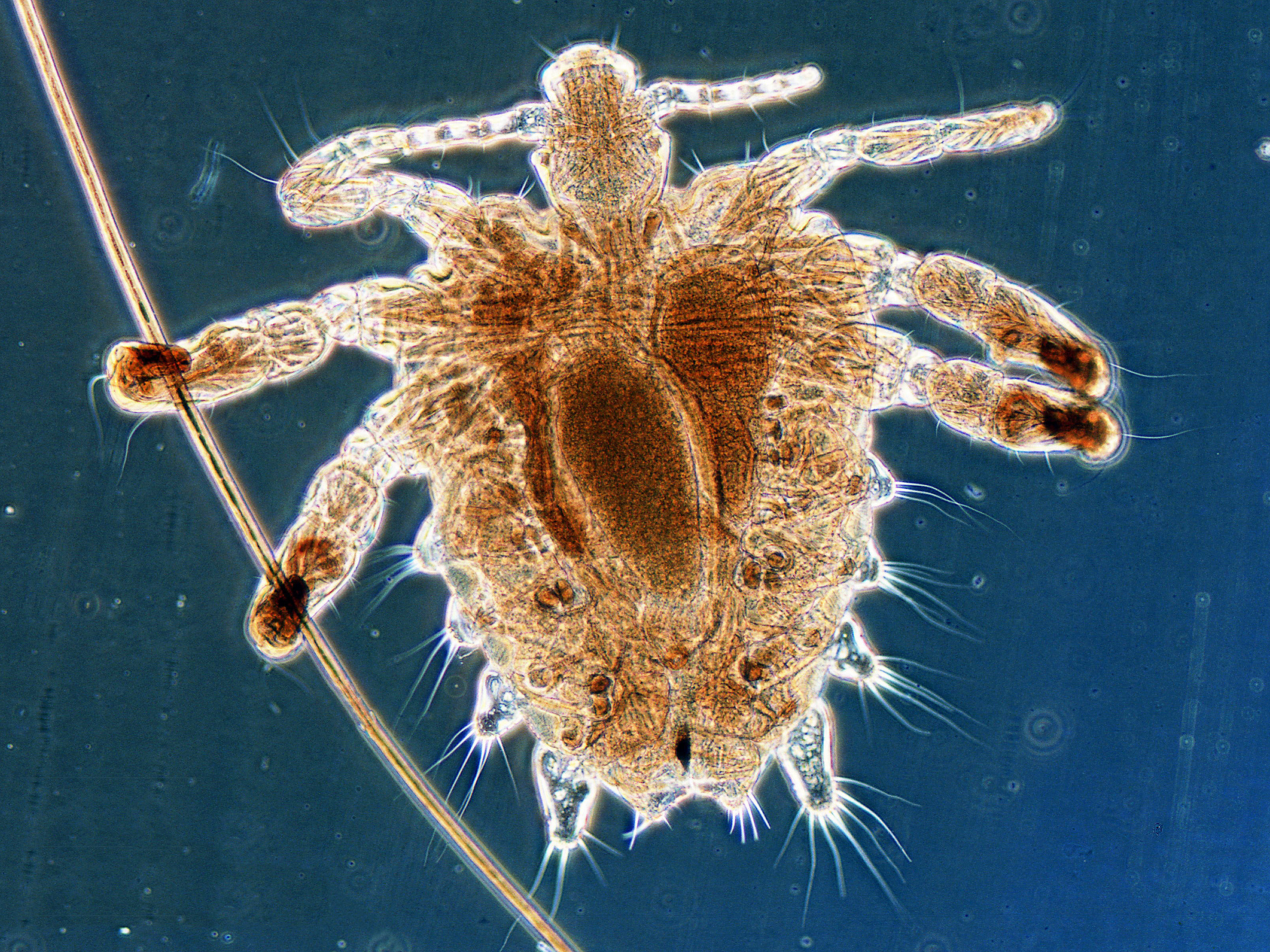 bewegende schaamluis onder de microscoop (met dank aan C.L.M. van Hees)