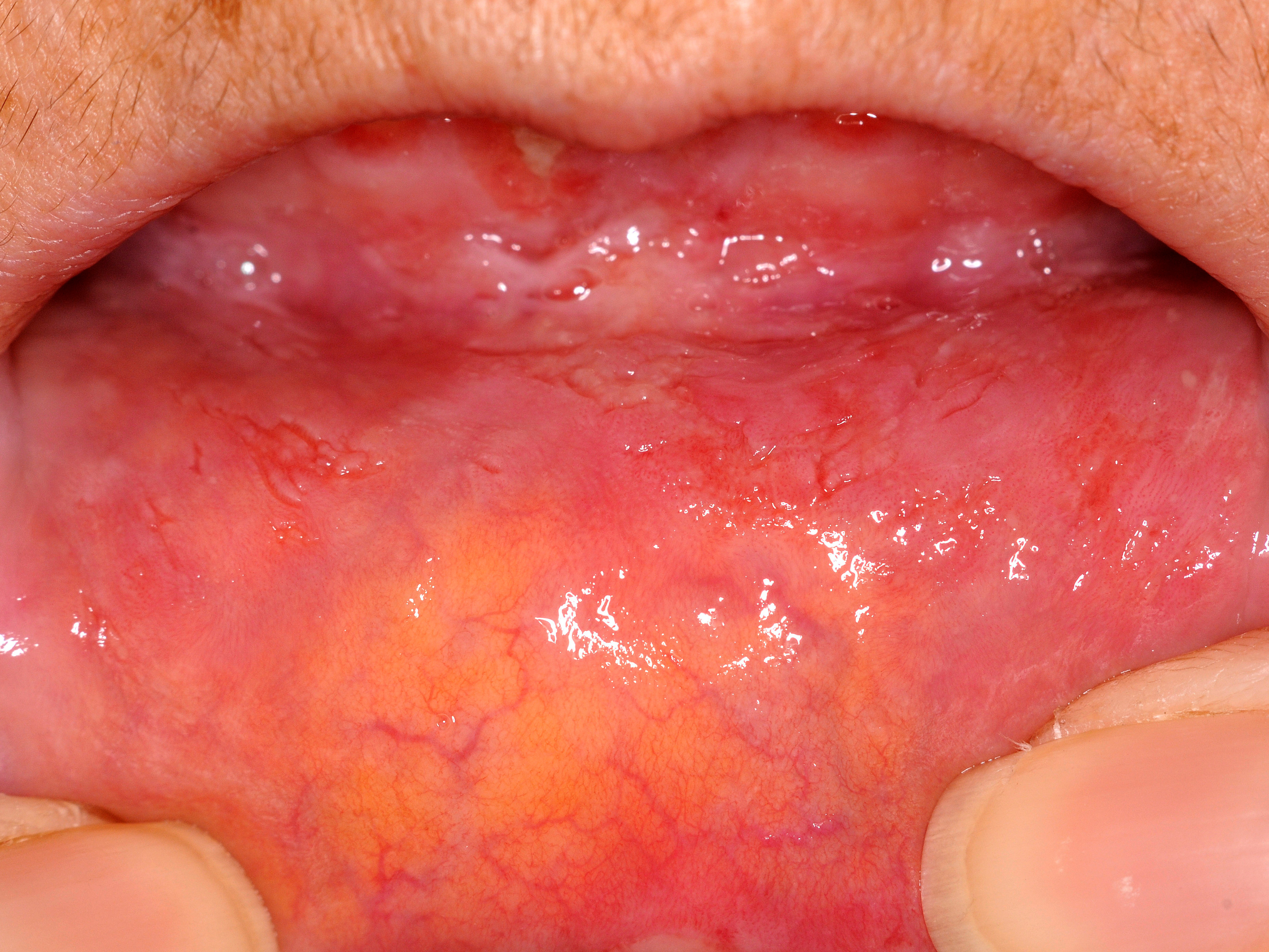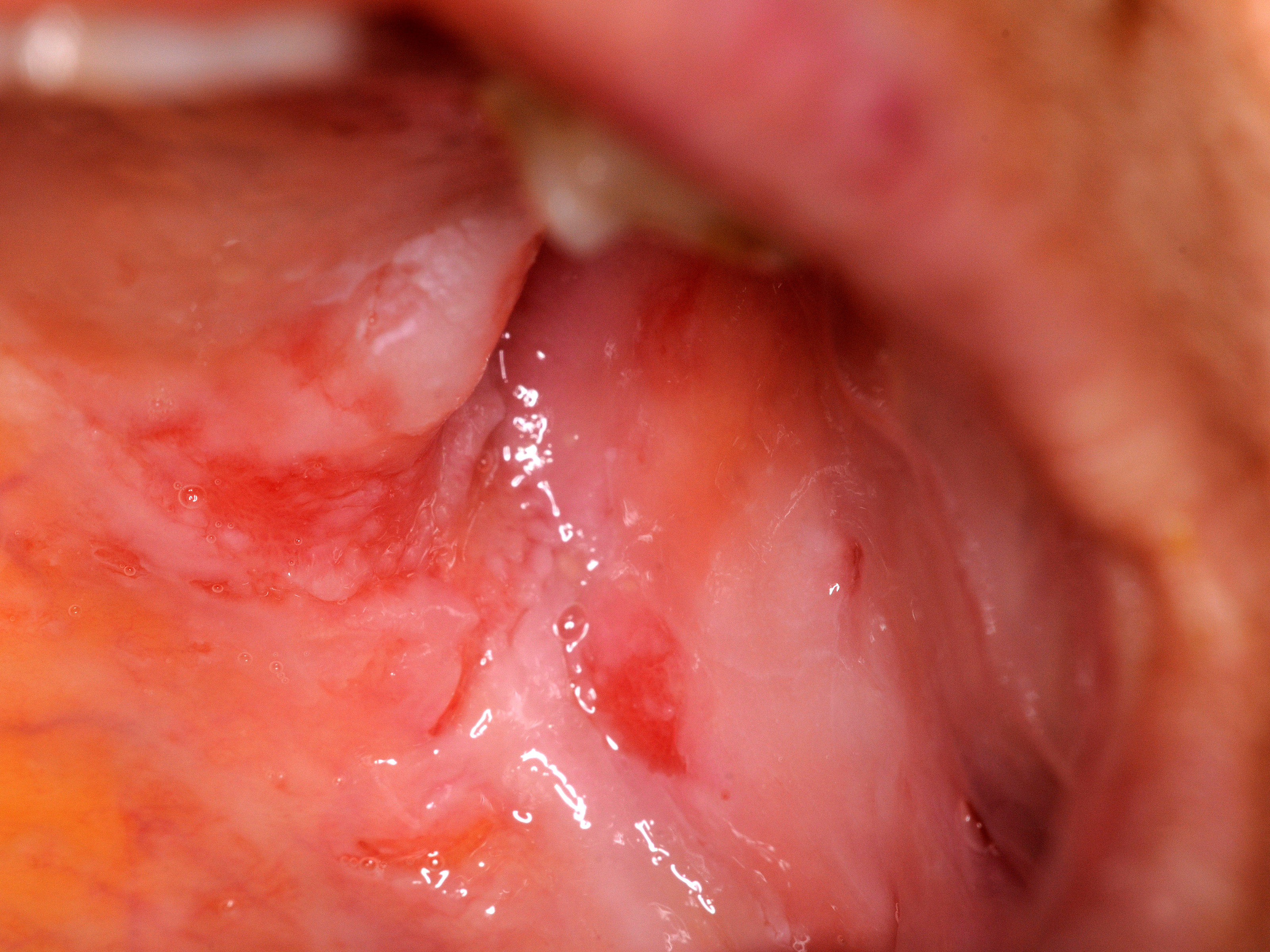 / oropharynx als eerste aangedaan met pijnlijke oppervlakkige erosies. Intacte