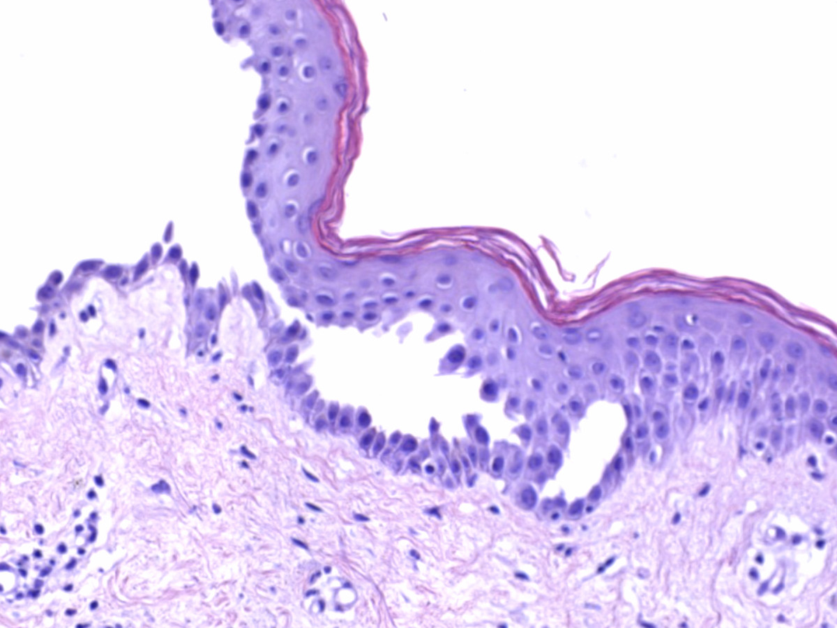 HE, de IF uit de normale peri-lesionale huid); vroeg stadium: spongiotische