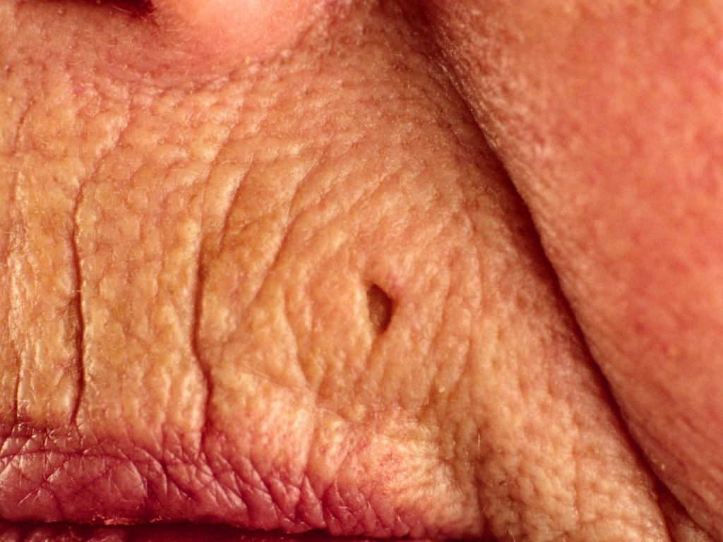 het gelaat, vooral rond de bovenlip. Het is niet hetzelfde als een pilar cyste