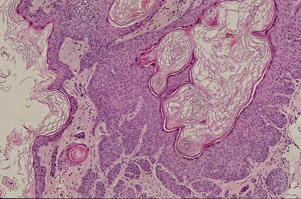 hoorn. Vaak rondom in de dermis lobuli van eosinofiel aankleurende cellen die