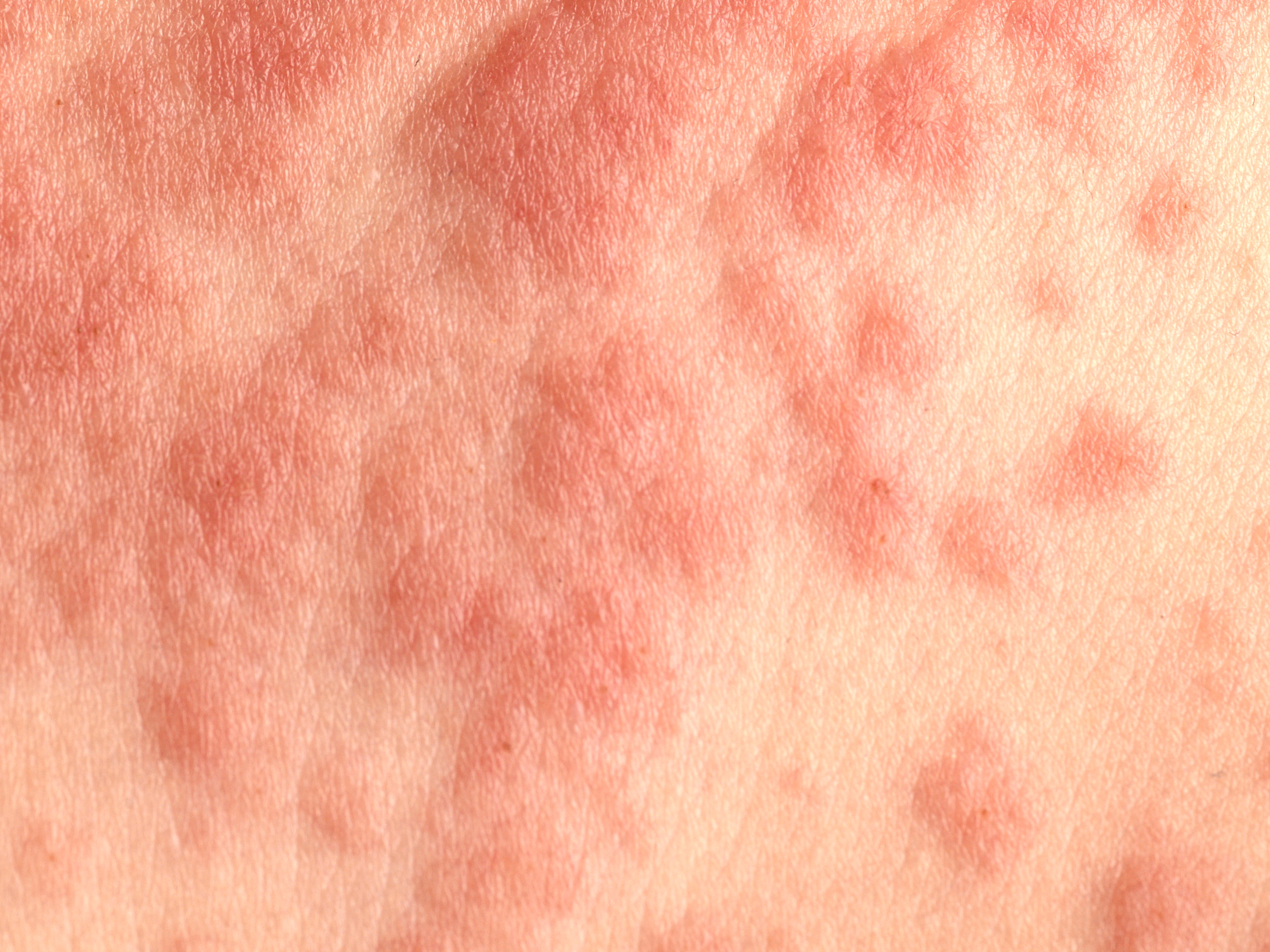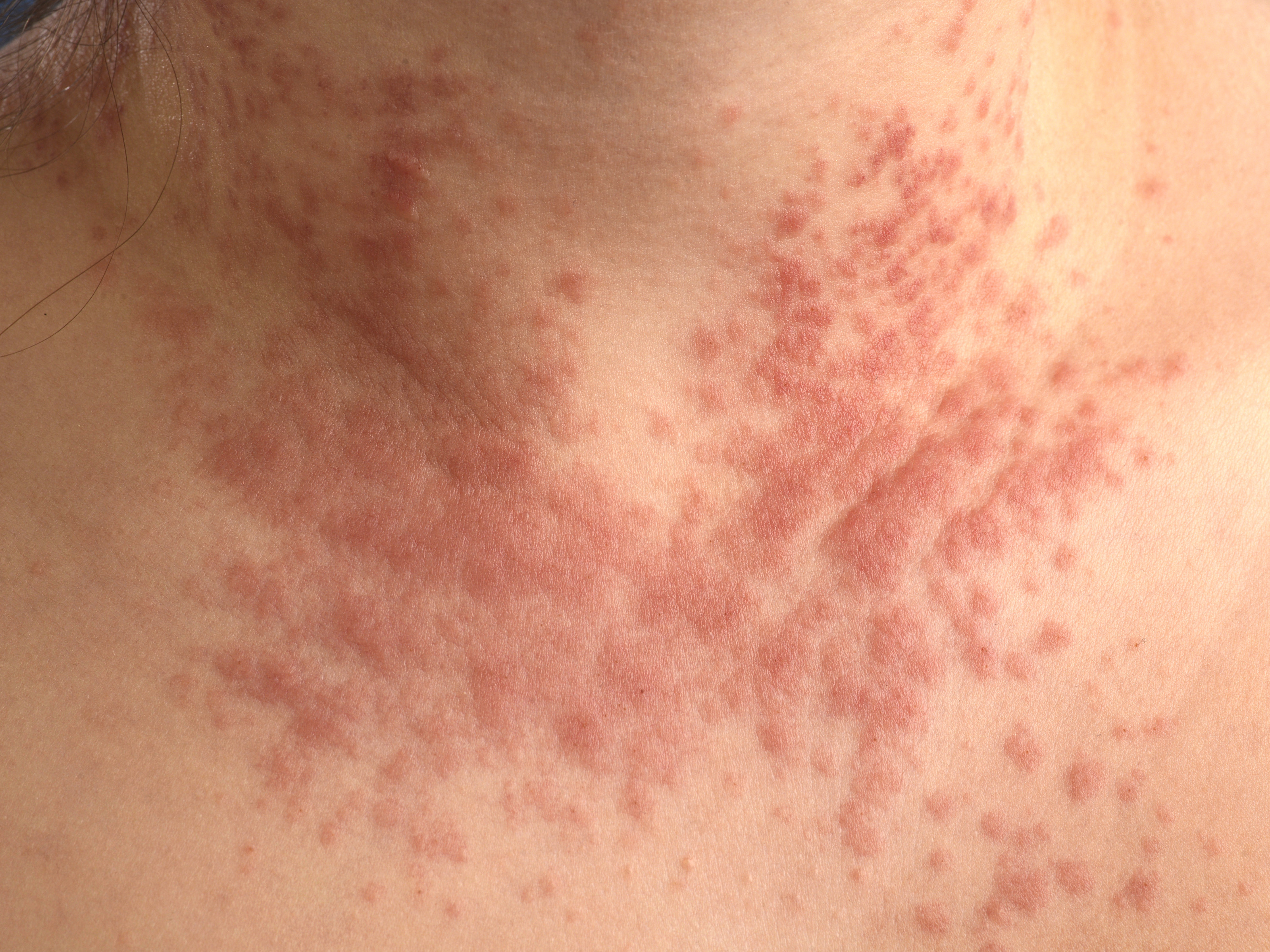 of op erythema multiforme of urticaria lijkende laesies. Niet vluchtig. Jeukend