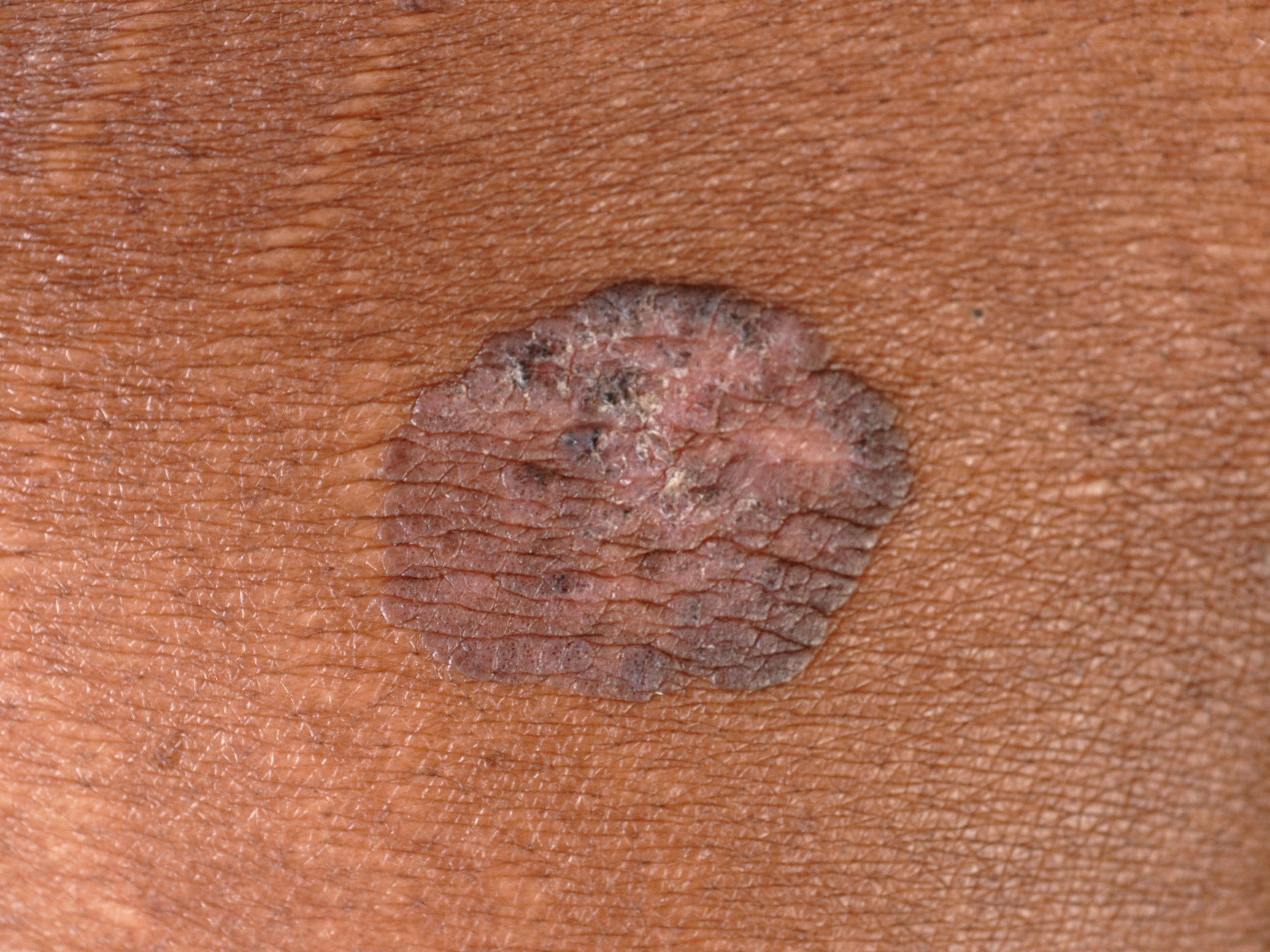 papels of nodi, 0.4-20 cm groot, huidkleurig, erythemateus of paars. Maar het