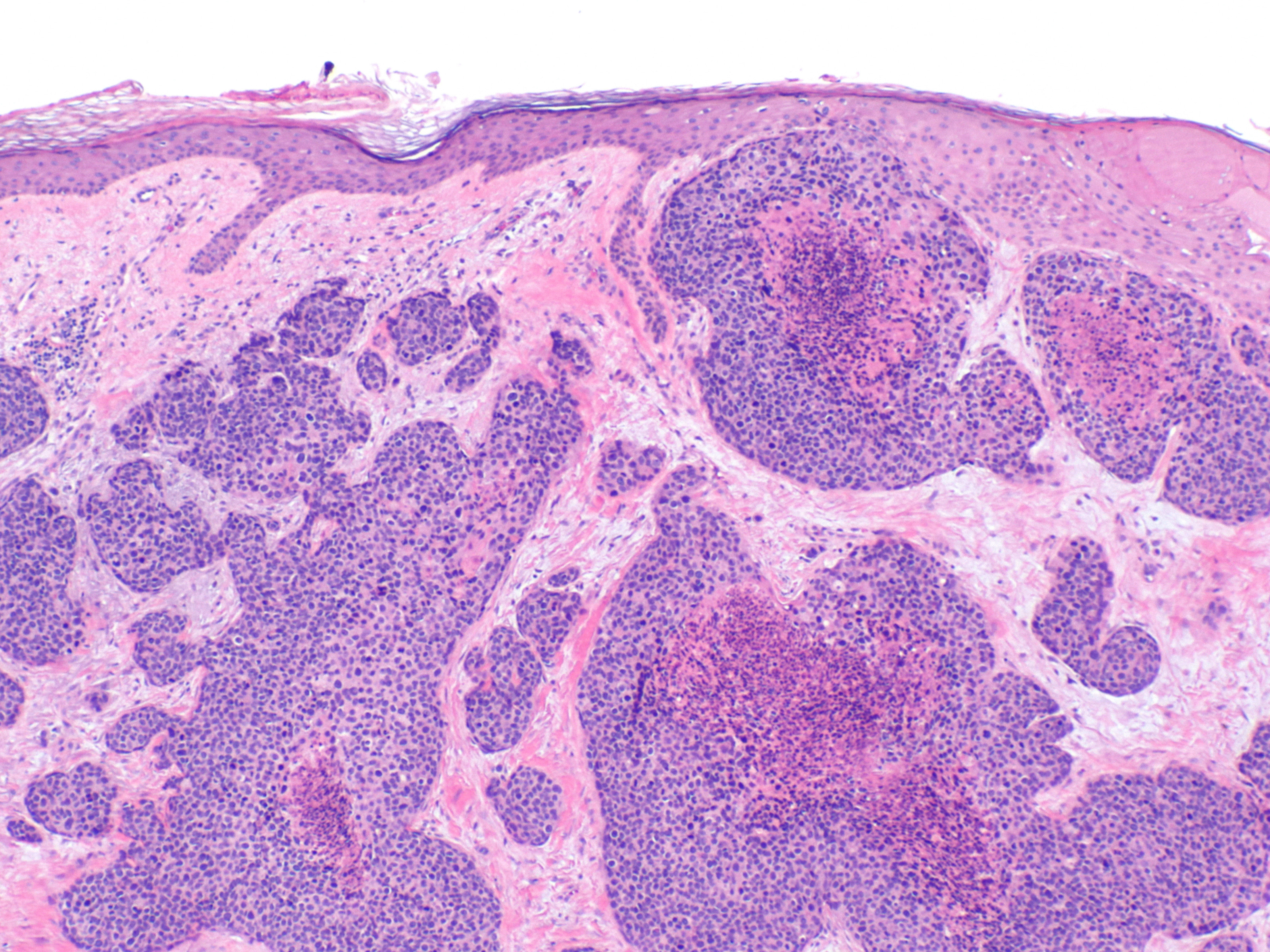 Multipele velden van basaloïde polygonale tumorcellen cellen met plaatselijk