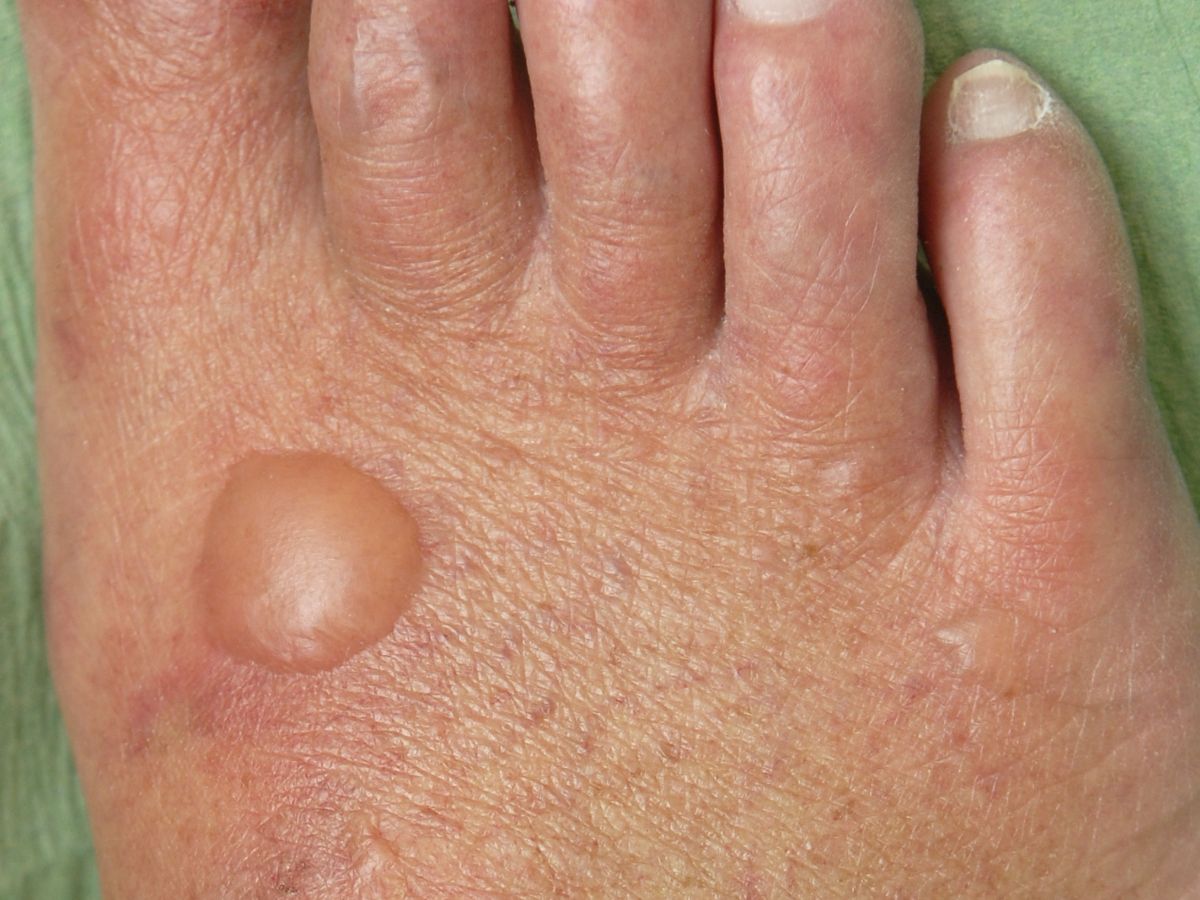 plaatsen, vooral handruggen en onderarmen. Milia (na beschadiging van de epidermis