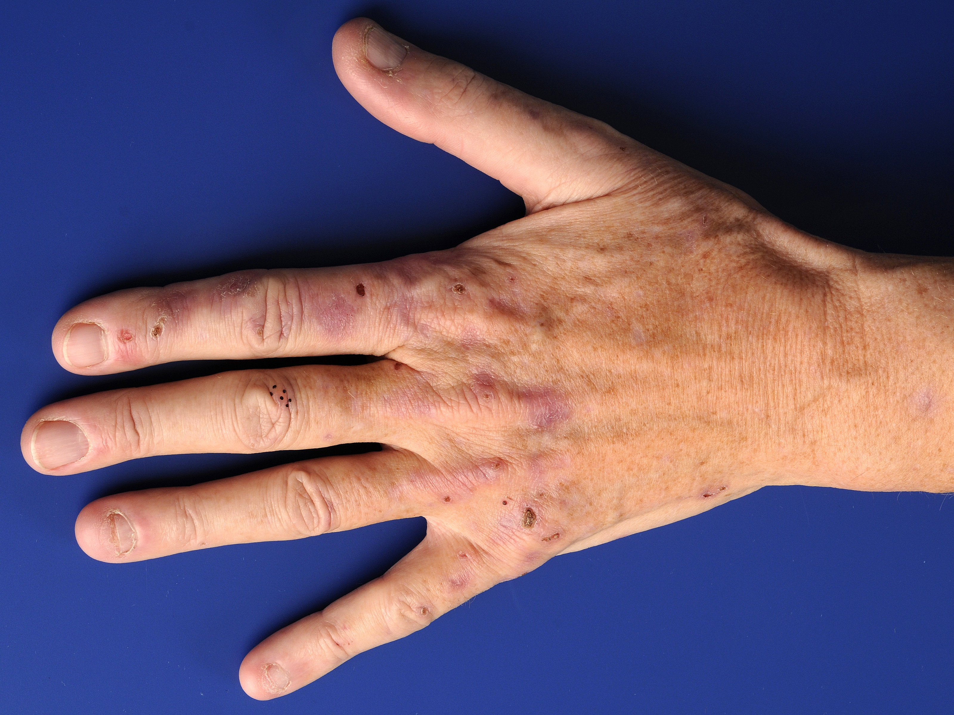 en milia op zongeëxposeerde plaatsen, vooral op de handruggen en in het gelaat.