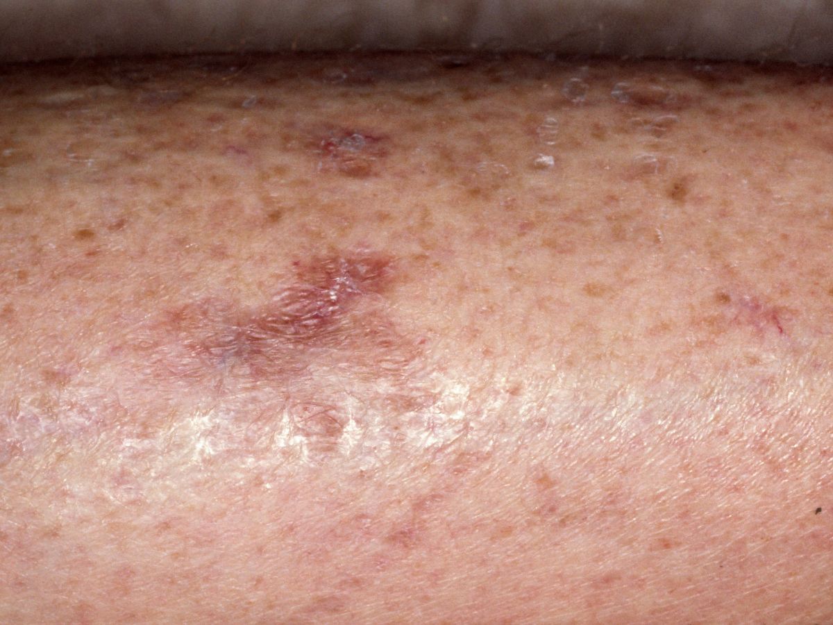 zijn kleine ronde plekken met een verheven rand, pretibiaal, soms met korstvorming