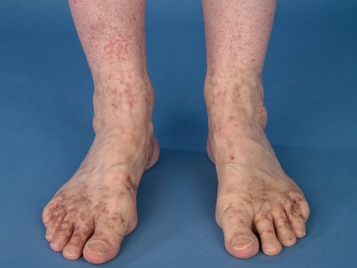 bruine of oranje bruine verkleuringen aan de onderbenen. Het veroorzaakt vooral