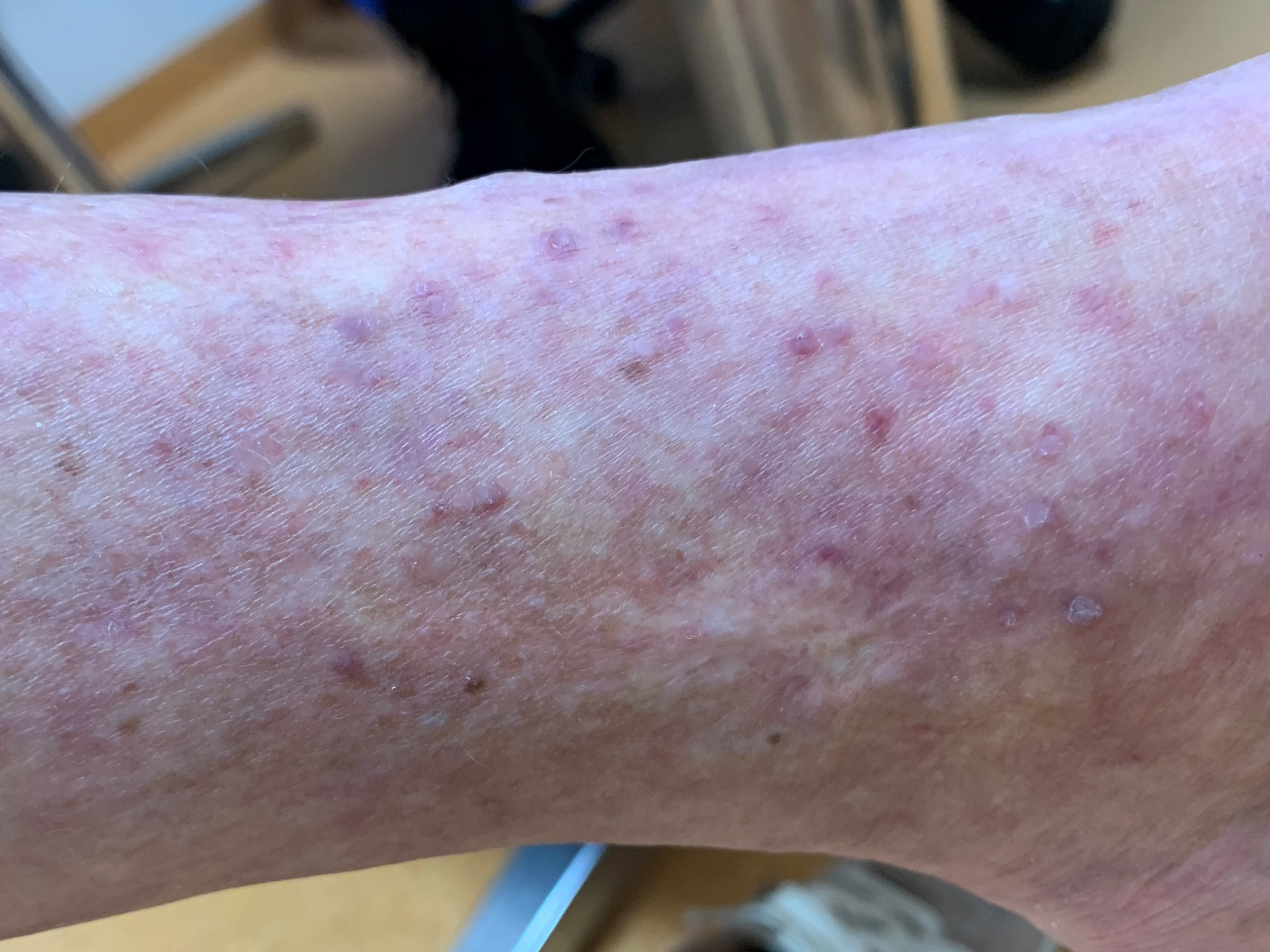 opgebouwd uit kleine bruine macula (Cayenne peper aspect) aan de onderbenen,