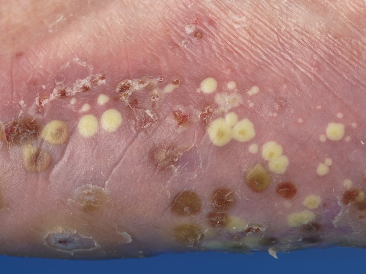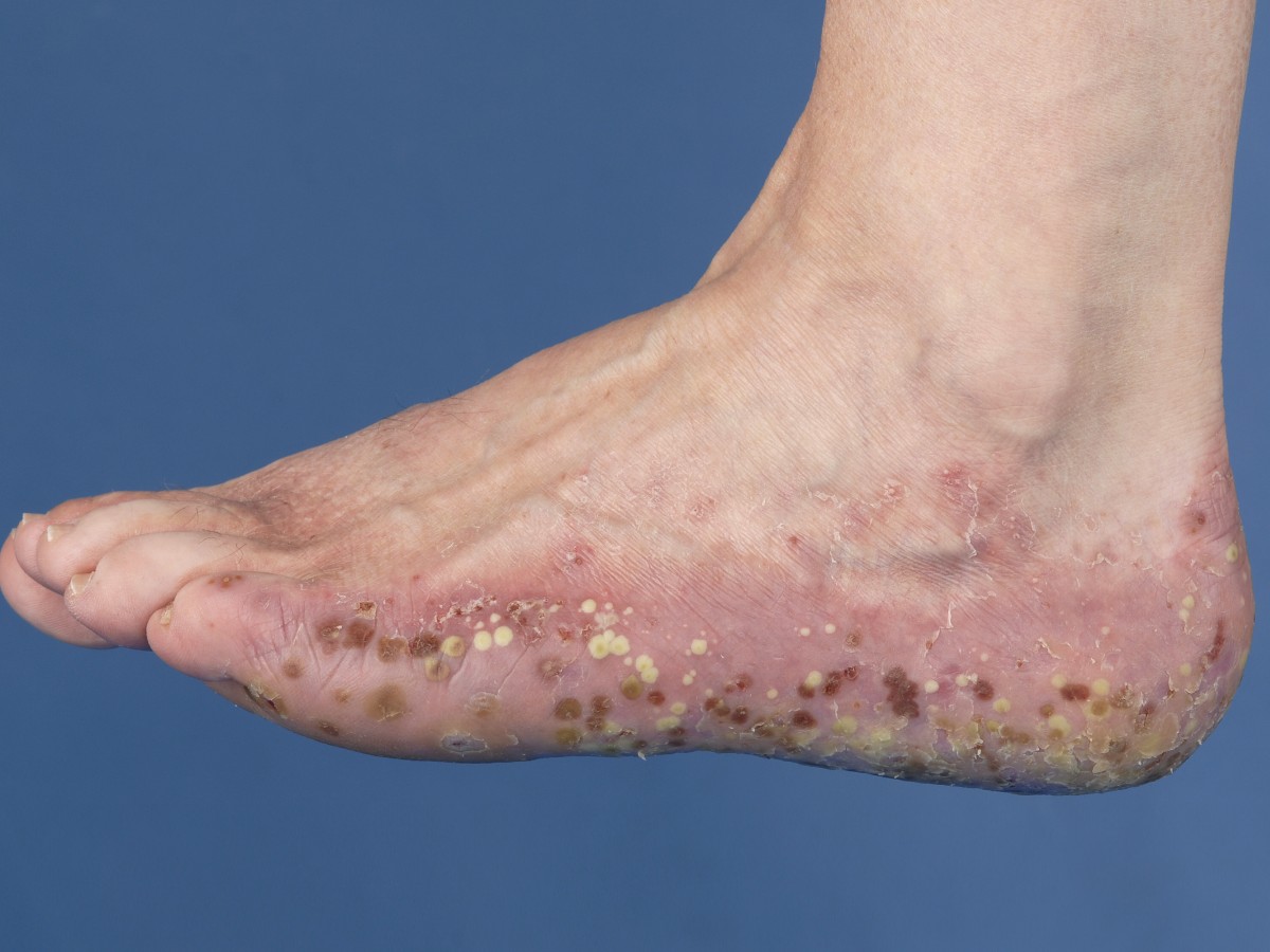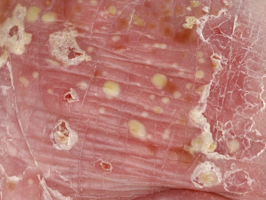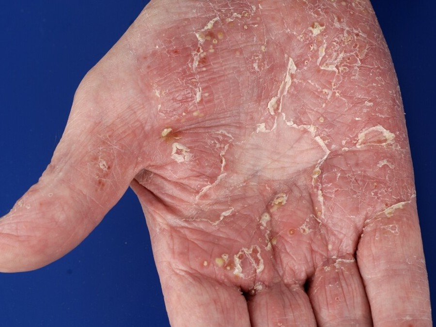 pustels (diameter 2-5 mm) op de voetzolen en/of de handpalmen, meestal symmetrisch.