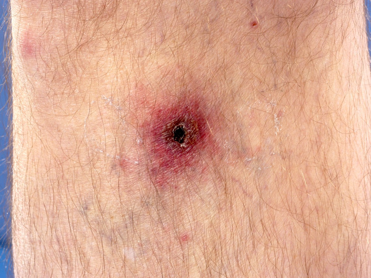 (Zuid en Oost Europa, Azie): necrose, erytheem, cervicale lymfadenopathie,