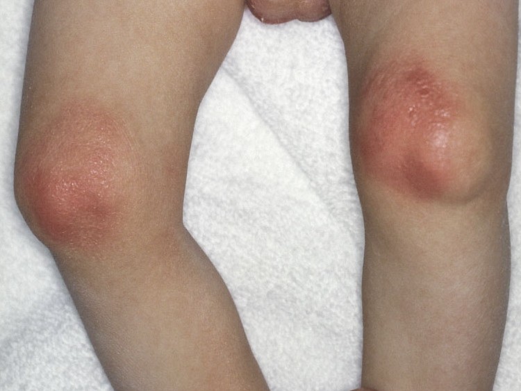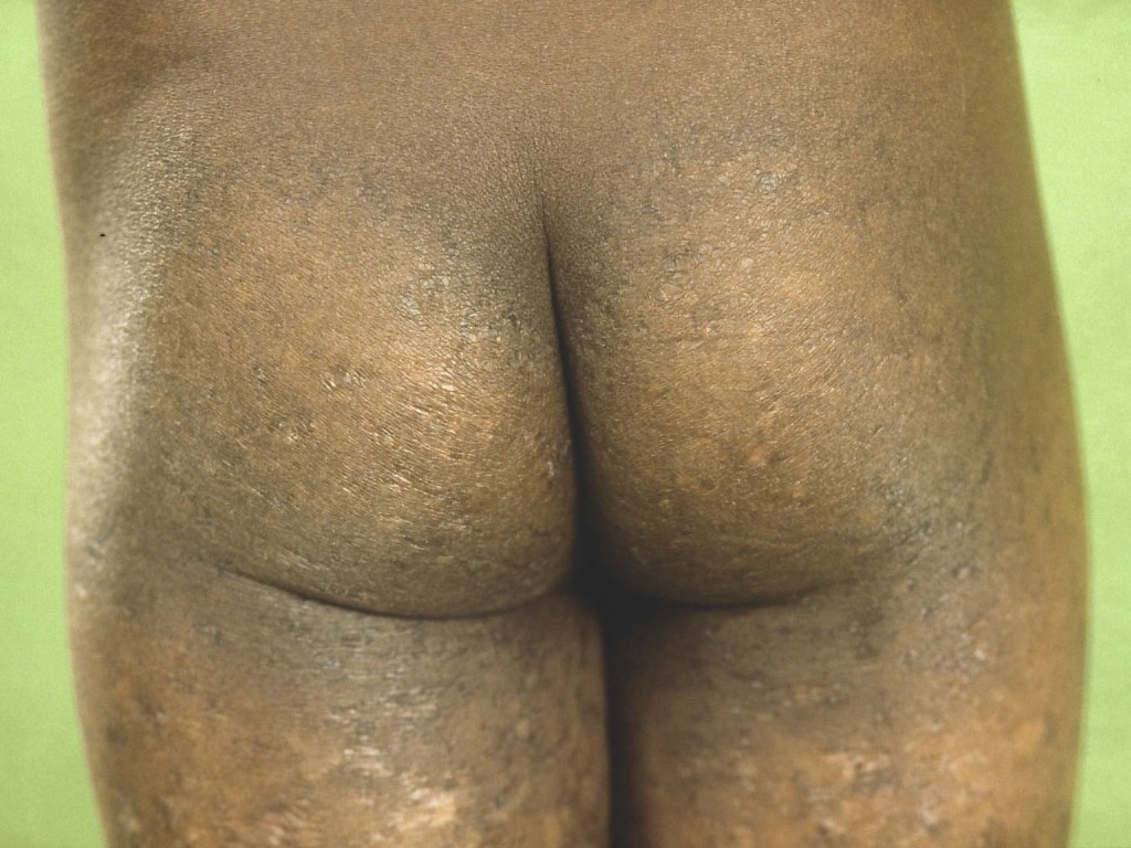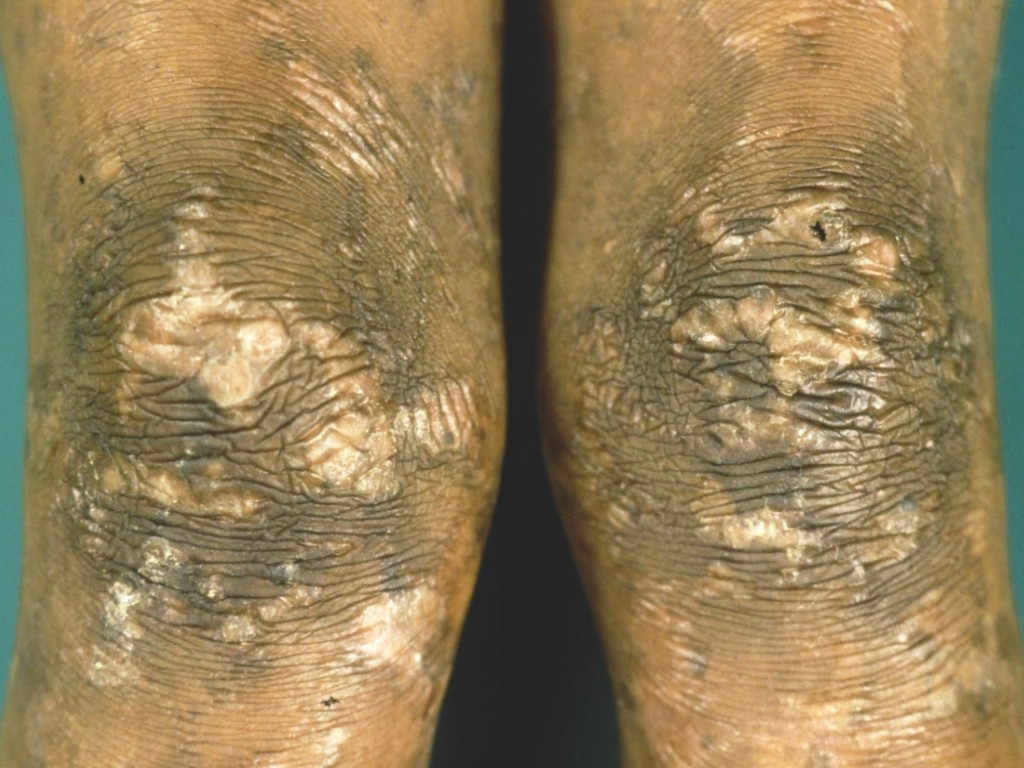 op de wangen, billen en extremiteiten, fotosensitiviteit,hyperkeratose op ellebogen,