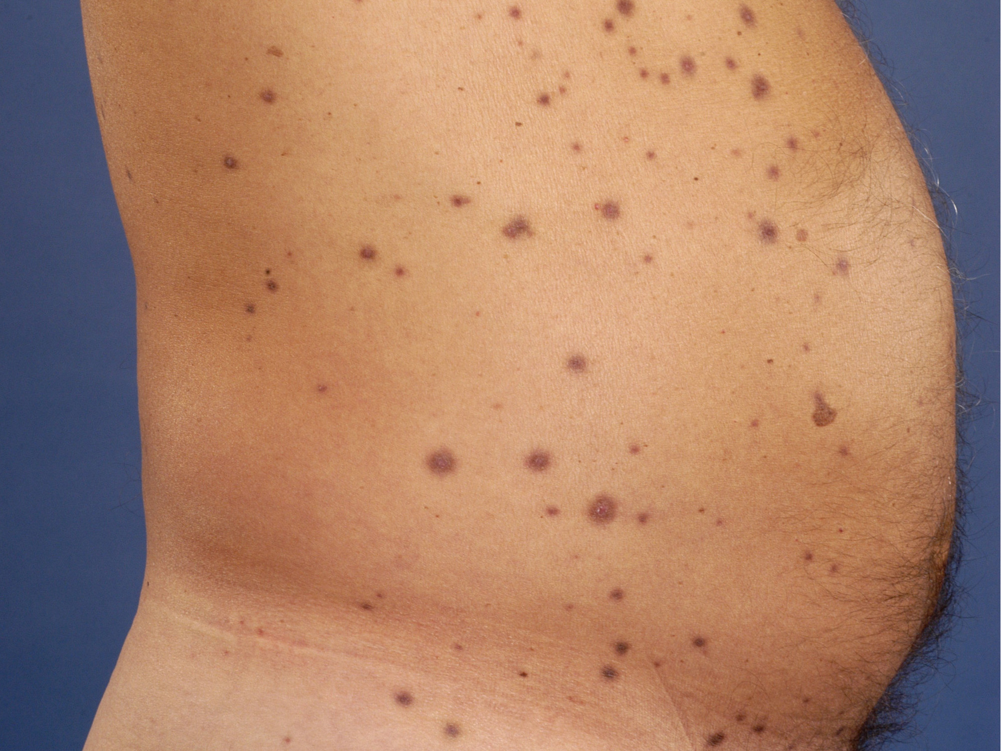 in erythemateuze tot violet bruine papels op de extremiteiten. Ook kunnen laesies