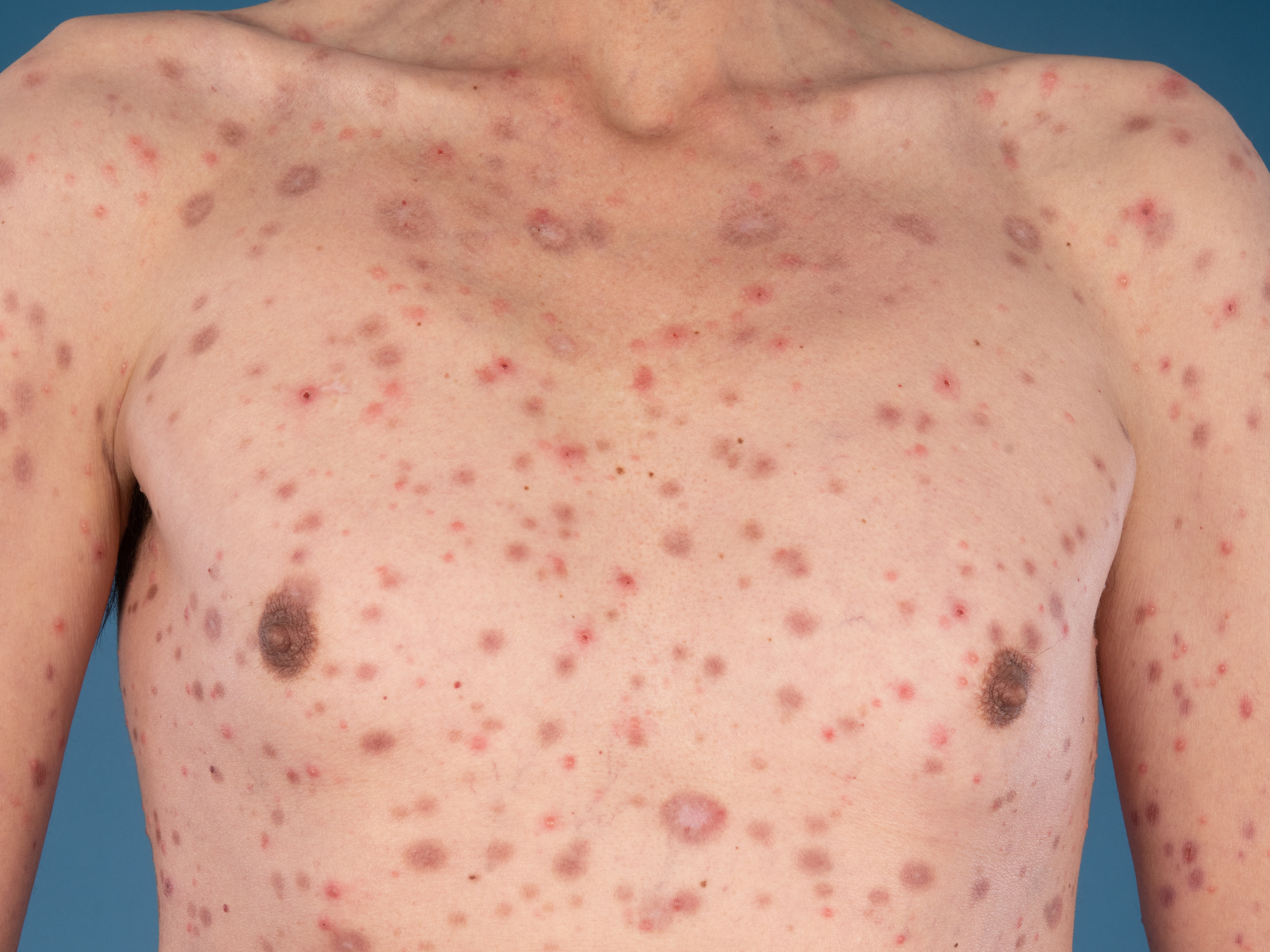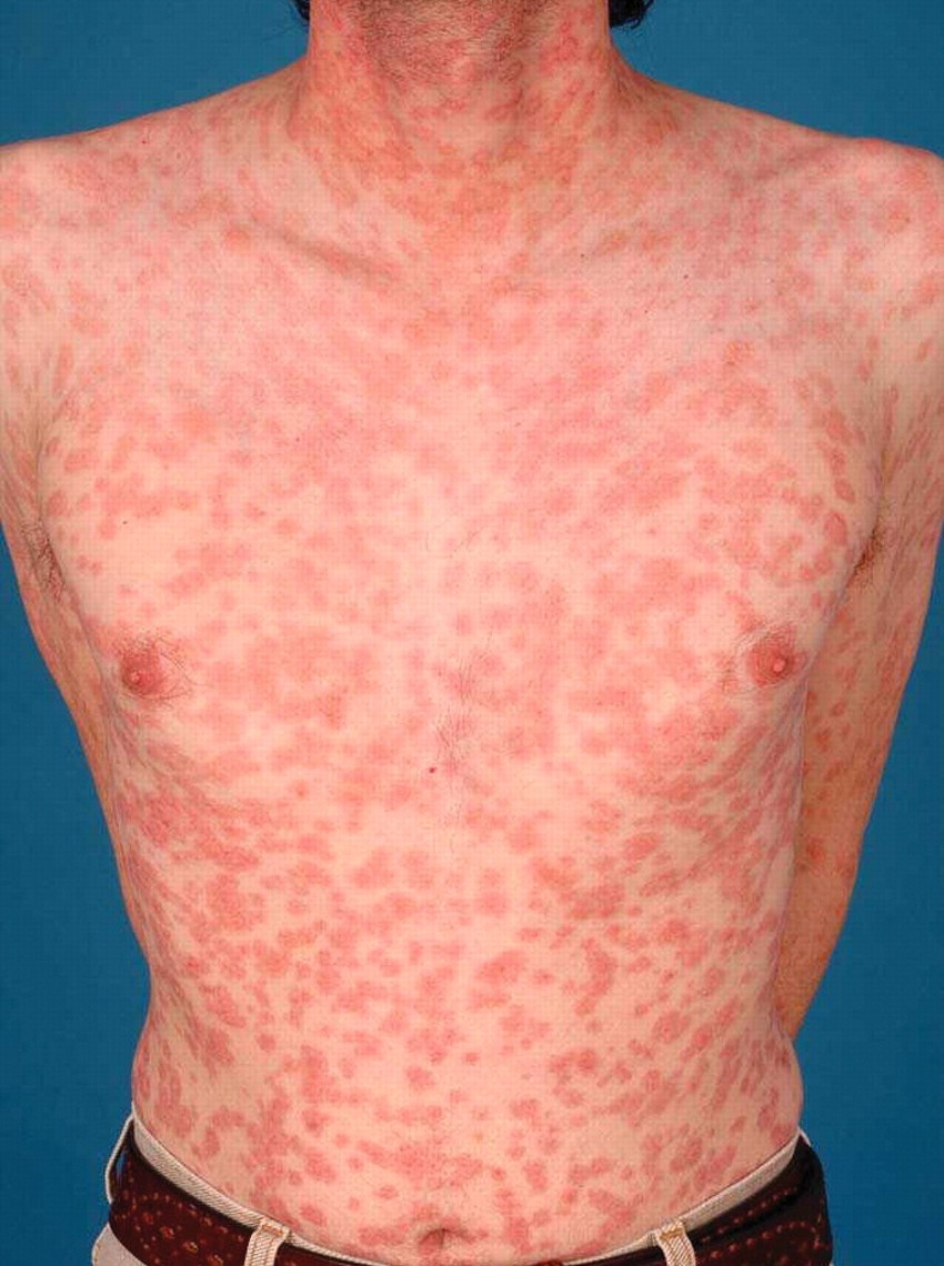 (lues II): maculopapuleus, meestal niet jeukend exantheem op romp