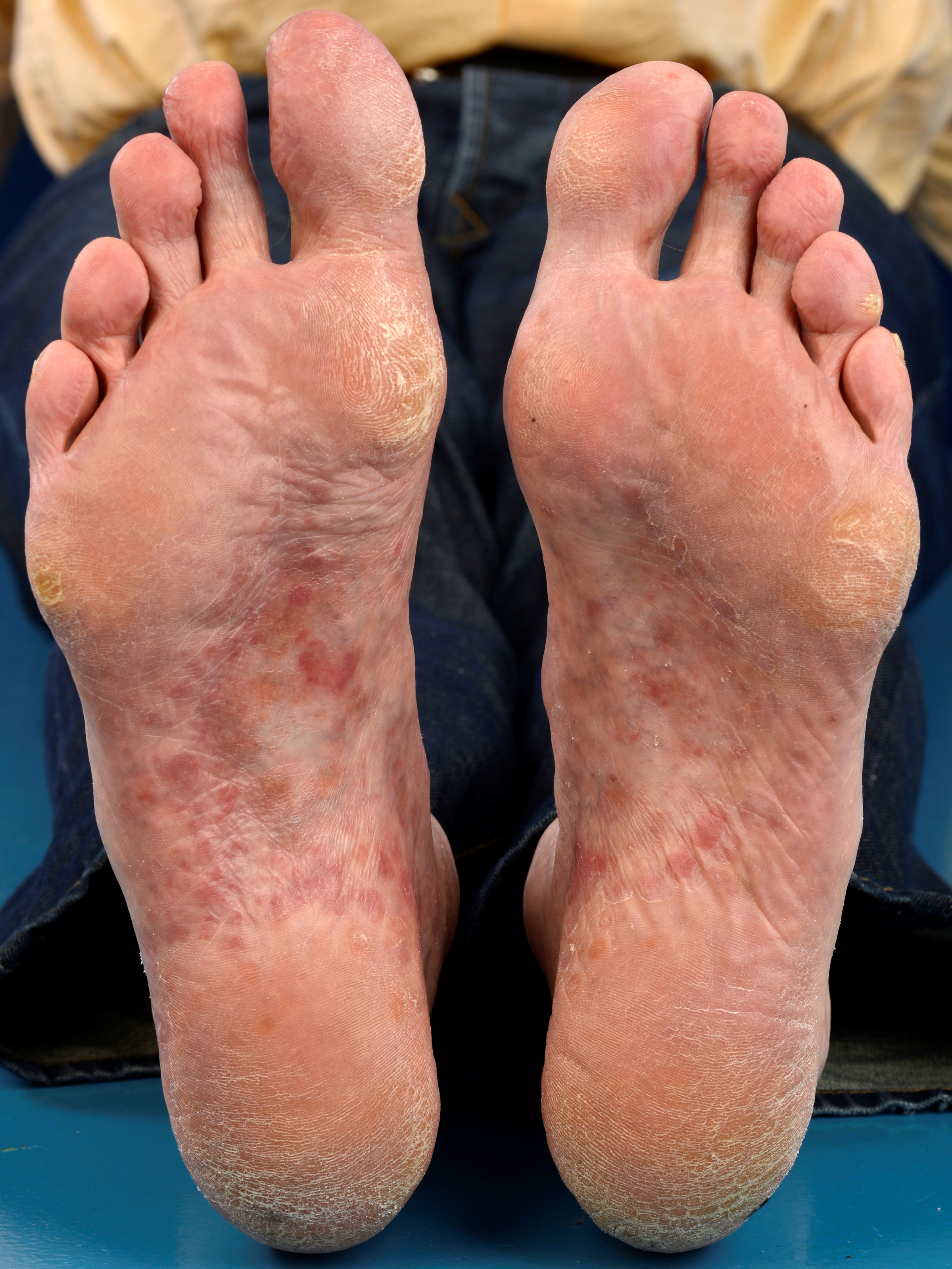 en extremiteiten, bij >70% exantheem handpalmen en voetzolen