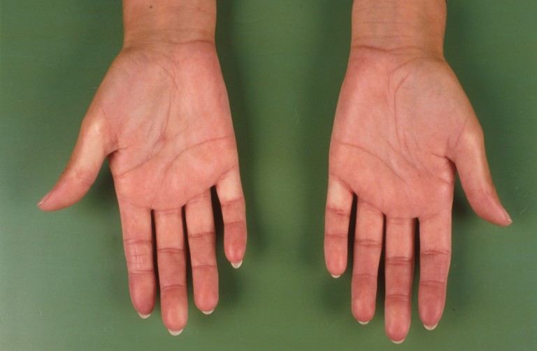 (stijve, gezwollen vingers). Vervolgens geïndureerde huidafwijkingen: de huid