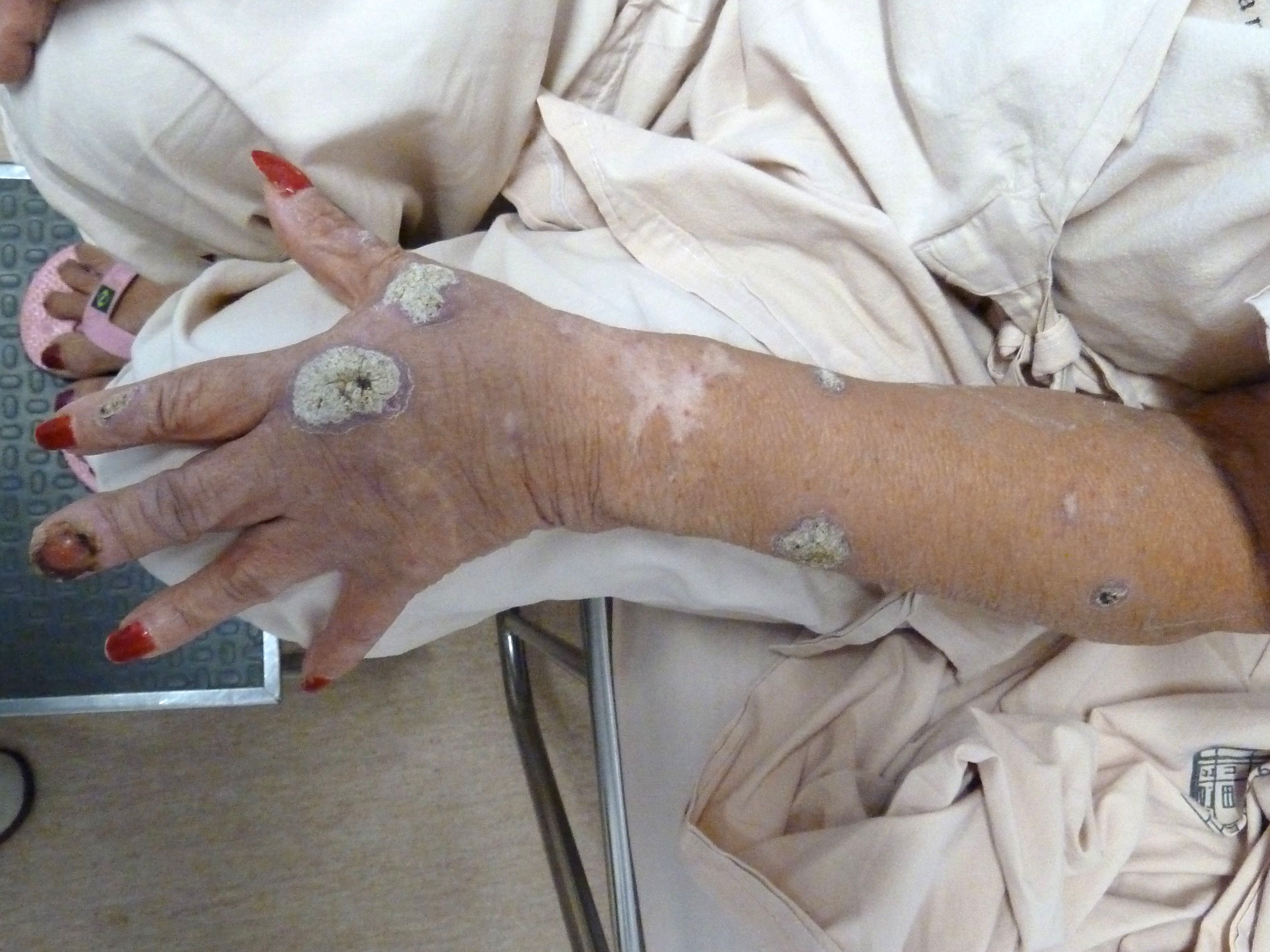 meestal aan een vinger, hand of onderarm. De nodus wordt groter en gaat ulcereren,
